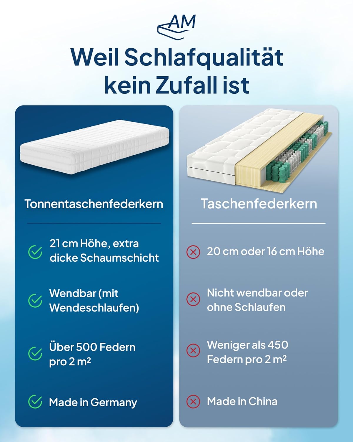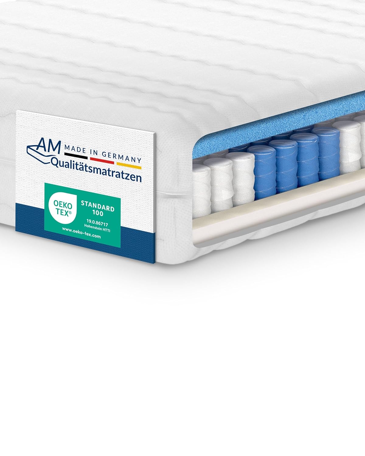 Die Marke AM Qualitätsmatratzen steht seit Jahren für Zuverlässigkeit, Langlebigkeit und Kundenzufriedenheit. Jede Matratze wird einzeln geprüft, bevor sie das Werk verlässt. Die Verwendung von formstabilen, hochelastischen Schaumstoffen und rostfreien Stahlfedern sorgt dafür, dass die Matratze auch nach Jahren noch ihre ursprünglichen Eigenschaften behält. Keine Besuchsrisse, kein Durchhängen, keine Verformungen – nur beständiger Schlafkomfort.