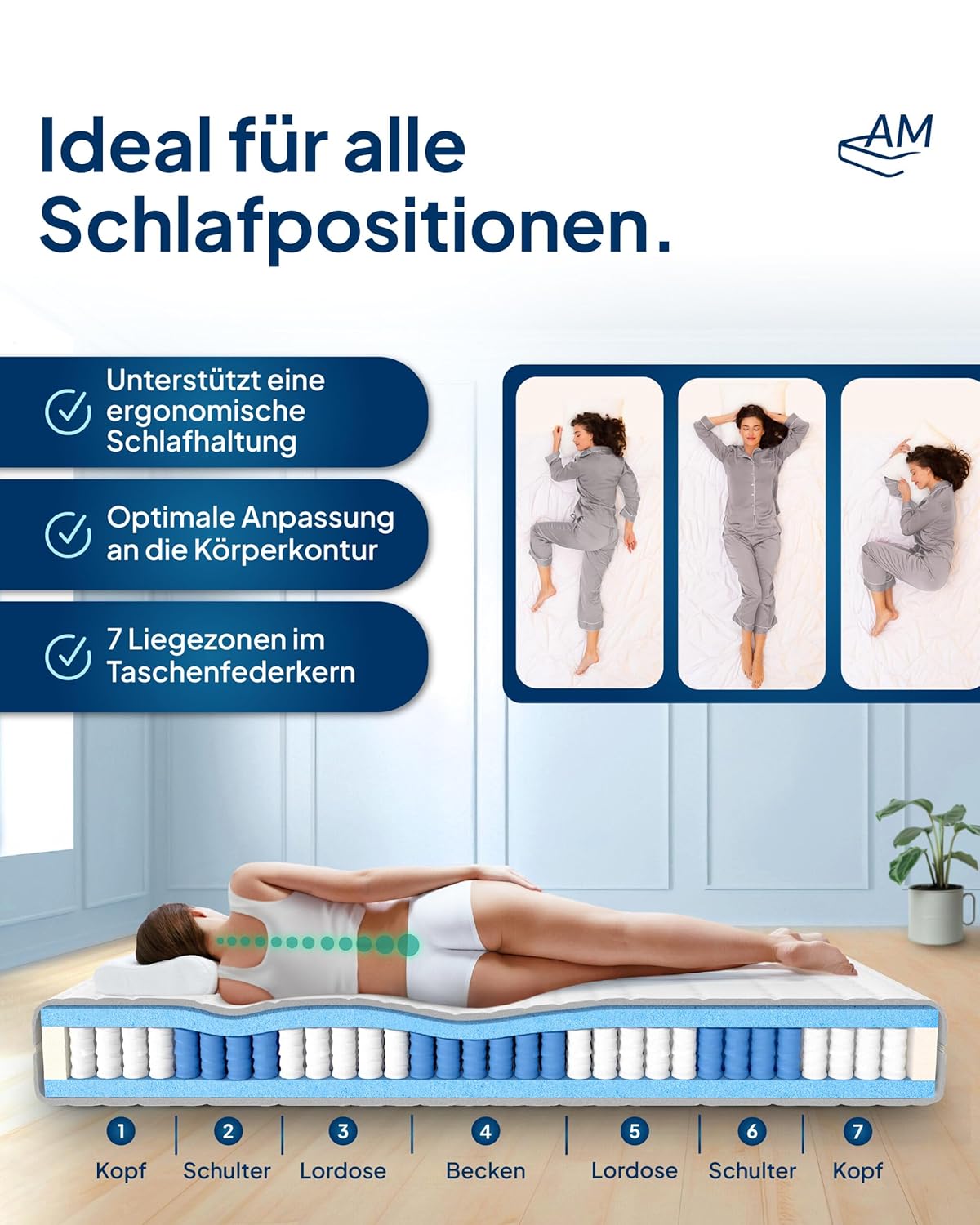 In einer Welt, in der Hektik, Termine und digitale Reize unseren Alltag bestimmen, wird der Schlaf zum wertvollsten Gut. Er ist die Quelle unserer Regeneration, die Basis für körperliche Leistungsfähigkeit und seelisches Gleichgewicht. Doch nur eine Matratze, die den individuellen Bedürfnissen des Körpers perfekt gerecht wird, kann diesen erholsamen Schlaf wirklich ermöglichen. Die AM Quality Orthopädische 7-Zonen-Taschenfederkernmatratze in den Maßen 160 x 200 cm ist kein gewöhnliches Schlafsystem – sie ist ein Meisterwerk deutscher Matratzenkunst, entwickelt für Menschen, die Wert auf Gesundheit, Langlebigkeit und exzellenten Schlafkomfort legen.
