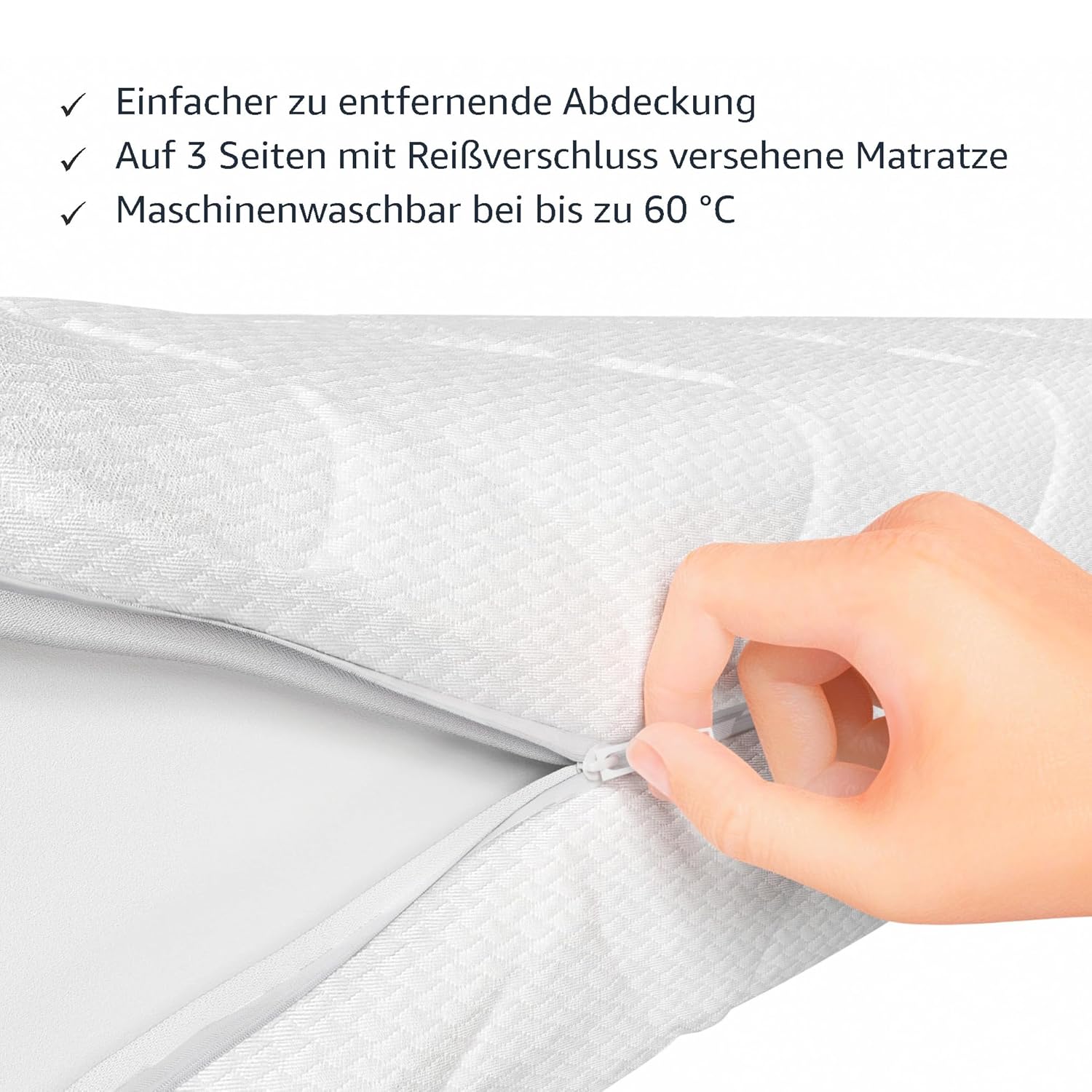 Besonders überzeugend: die hochwertige, zweiteilige Bezugkonstruktion aus strapazierfähigem Polyester, die nicht nur angenehm weich auf der Haut liegt, sondern dank ihres Reißverschlusses komplett abgenommen und bei bis zu 60 °C in der Maschine gewaschen werden kann. Für Familien, Haushalte mit Kindern oder empfindliche Schläfer mit allergischen Reaktionen bedeutet das ein Höchstmaß an Hygiene und langanhaltender Frische – ganz ohne chemische Reinigung oder aufwendige Pflege.