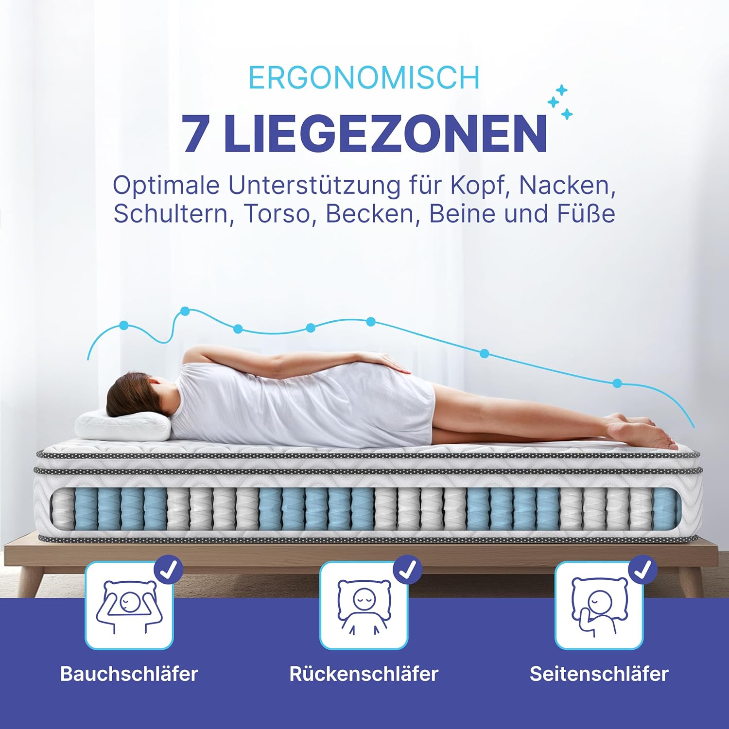 • 7-Zonen-Taschenfederkern mit 640 Federn (bei 140 x 200 cm) für punktgenaue Unterstützung