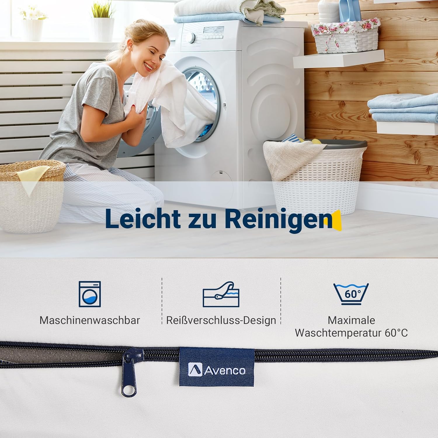 Der abnehmbare Bezug aus hochwertigem, schadstoffgeprüftem Gewebe kann bei Bedarf ganz einfach abgezogen und bei 60 °C in der Waschmaschine gereinigt werden. Diese hohe Waschtemperatur sorgt nicht nur für die Entfernung von Flecken, sondern tötet auch Bakterien, Milben und andere Mikroorganismen ab. So bleibt die Matratze über Jahre hinweg frisch, hygienisch und geruchlos – ein echter Pluspunkt für jedes Schlafzimmer. Der Reißverschluss ist robust verarbeitet und ermöglicht ein schnelles Abnehmen und Wiederanbringen des Bezugs, ohne dass die Matratze extra aus dem Lattenrost genommen werden muss.