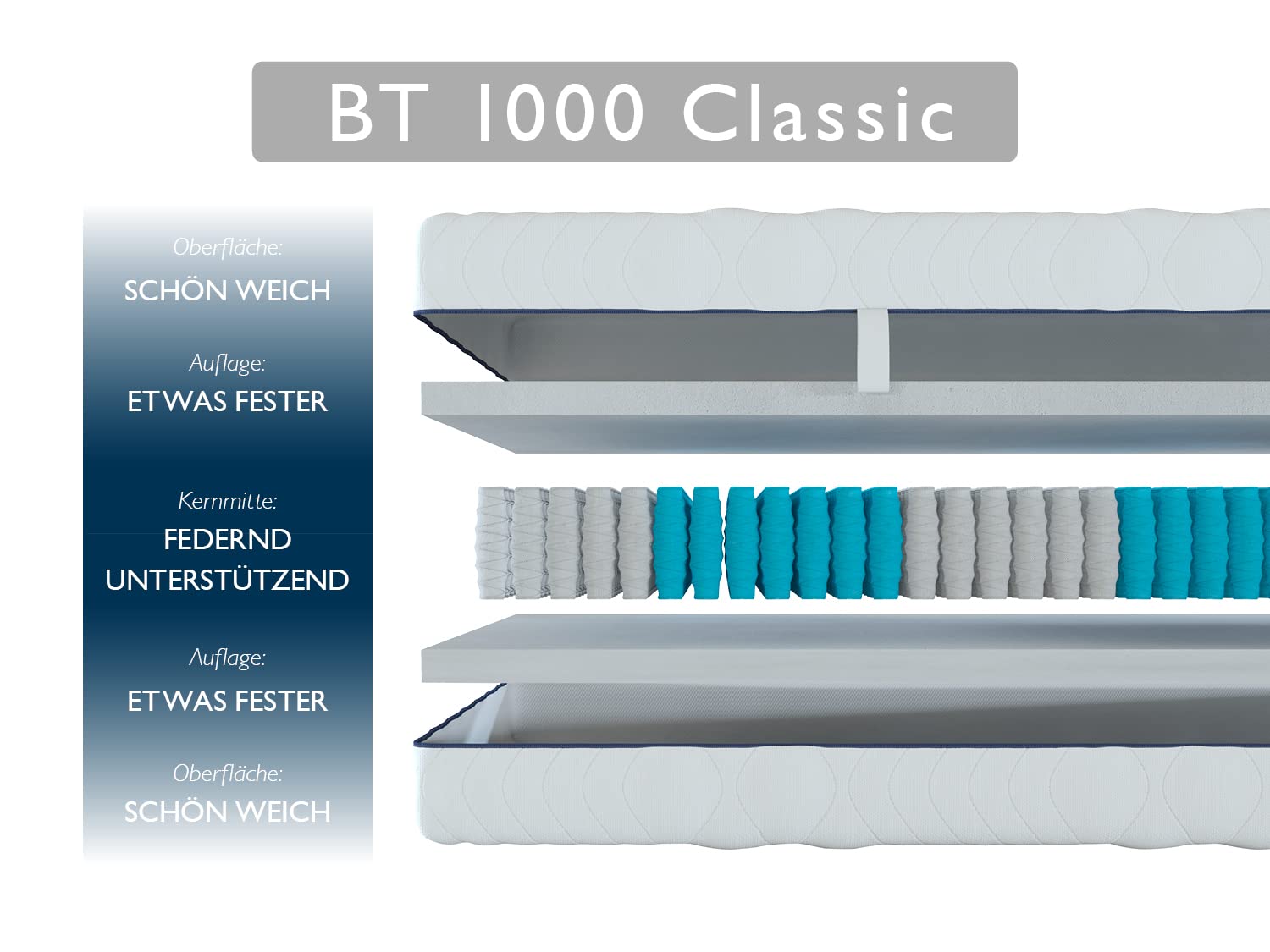 Mit 1.000 einzeln umhüllten Taschenfedern in sieben anatomisch optimierten Liegezonen passt sich die BT1000 perfekt der individuellen Körperform an. Ob Sie auf dem Rücken, der Seite oder dem Bauch schlafen – die Matratze unterstützt jede Schlafposition mit punktgenauer Körperstabilisierung und entlastet gleichzeitig die Wirbelsäule. Die Integration einer beidseitig angebrachten Komfortschaumauflage und eines hochatmungsaktiven Bezugs aus Viskose-Polyester-Mischgewebe schafft ein Schlafklima, das Feuchtigkeit reguliert, Wärme ableitet und Allergikern besonderen Komfort bietet.