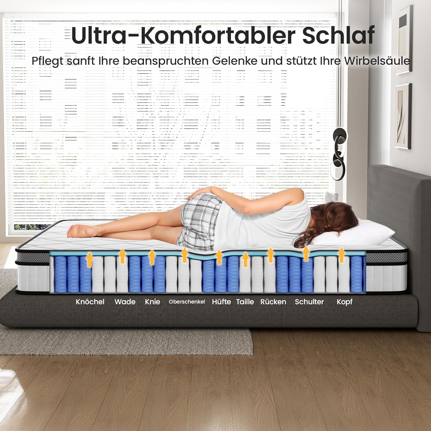 Entdecke den BedStory Hybrid-Matratze 160 x 200 cm – der ultimative Schlafgenuss durch intelligente Kombination aus punktelastischen Taschenfedern und hochdichtem Komfortschaum, die deinen Körper perfekt stützt und sanft umarmt. Schlaf besser, seitlich, auf dem Rücken oder Bauch – die Matratze passt sich jeder Schlafposition an, entlastet Schultern, Hüften und Wirbelsäule und beugt Rückenschmerzen vor. Dank…
