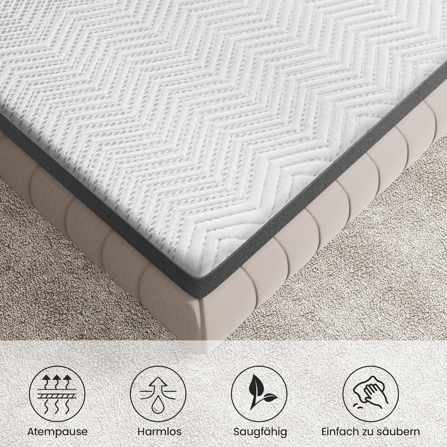 • Zwei-Schicht-Aufbau: Gel-Memory-Foam + hochdichter Trägerschaum für mittelharte, stützende Liegefläche