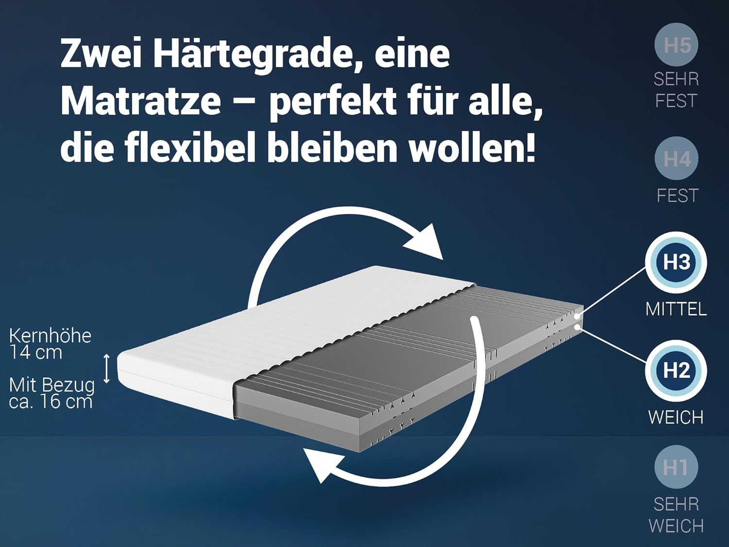 Schlafen Sie natürlicher und wachen Sie erholt auf – die reversible Matratze KSP-500 von Betten-ABC bietet mit H2 und H3 zwei Härtegrade in einer Matratze und passt sich so perfekt Ihren Schlafbedürfnissen an. Dank 7-Zonen-Schnitt entlastet sie gezielt Druckpunkte und stützt Körper für gesunden, tiefen Schlaf – egal ob Sie auf dem Rücken, Bauch oder…