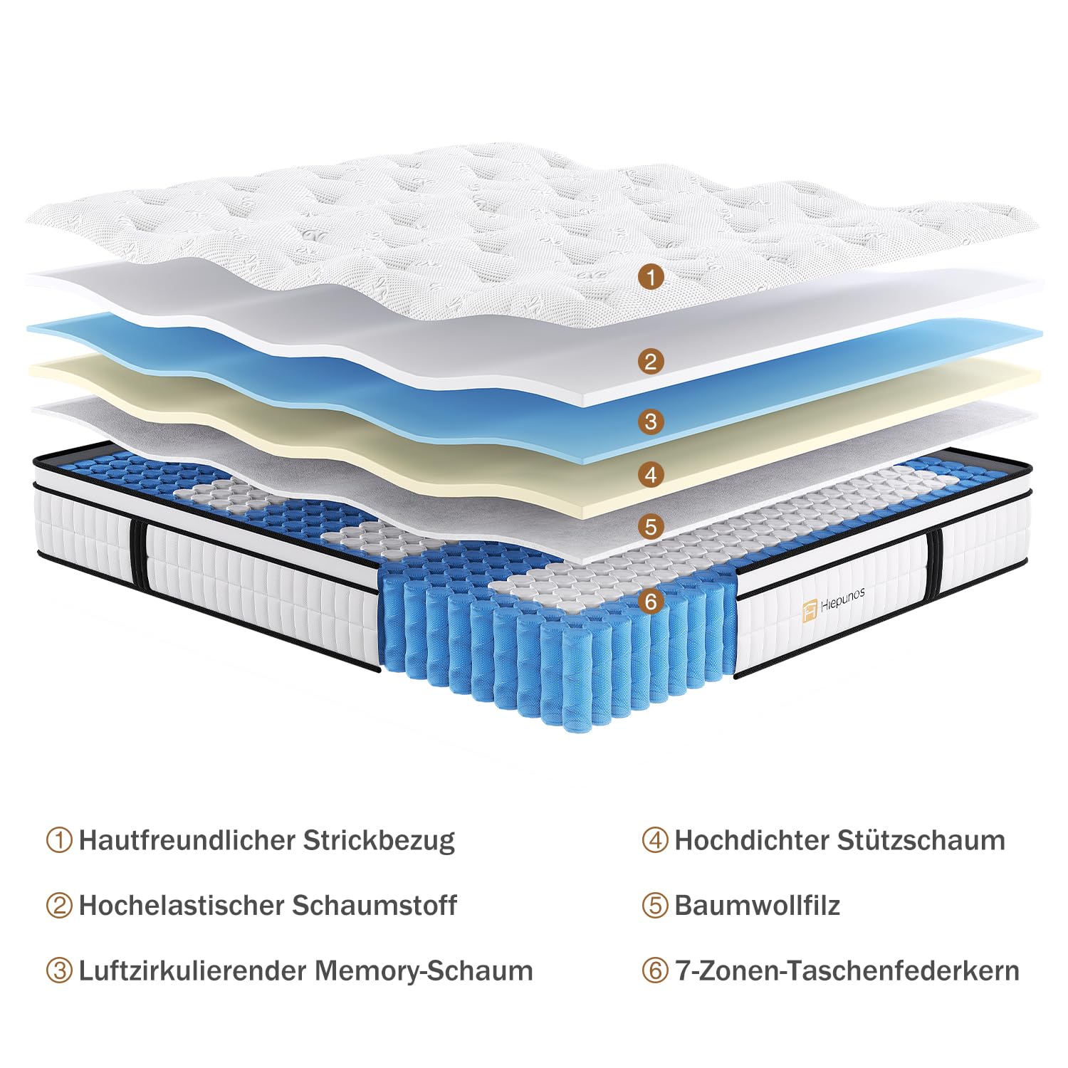 Hiepunos Pocket Spring Mattress 180 x 200 cm – 26 cm Höhe, H3, 7-Zonen Kaltschaum-Kern mit Komfort-Memory-Schicht – Orthopädische Schlafunterstützung für gesunde Wirbelsäule & erholsamen Schlaf