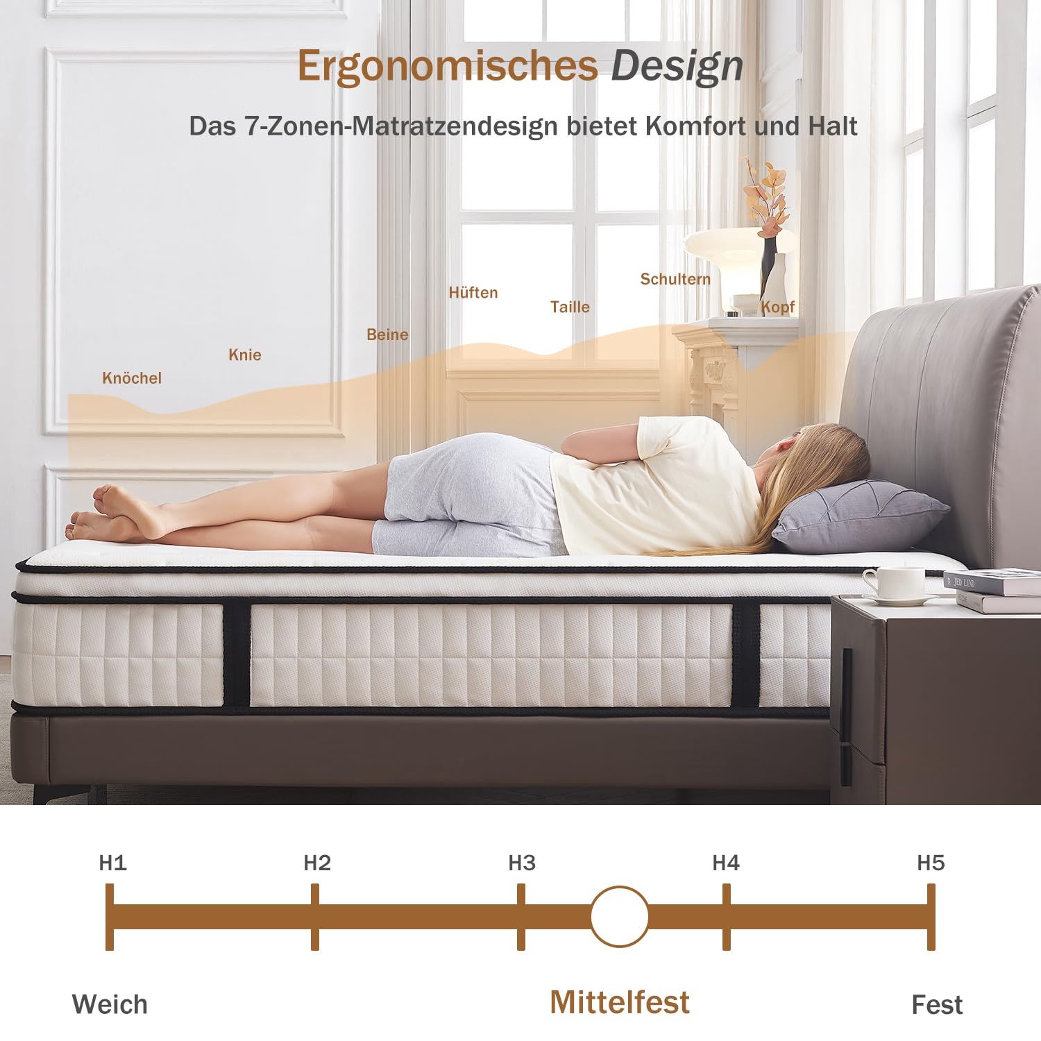 Die Hiepunos Pocket Spring Matratze ist mehr als ein Möbelstück – sie ist ein Gesundheitsprodukt, das Ihren Körper nachts regeneriert, Ihre Wirbelsäule schont und Ihr Schlafklima verbessert. Mit ihrer durchdachten Hybrid-Konstruktion, den hochwertigen, zertifizierten Materialien und der präzisen 7-Zonen-Unterstützung schafft sie die Voraussetzungen für einen Schlaf, der nicht nur lang, sondern vor allem tief und erholsam ist. Für Familien, Paare, Singles oder Gesundheitsbewusste – diese Matratze begleitet Sie durch Jahre voller guter Nächte und starker Tage.