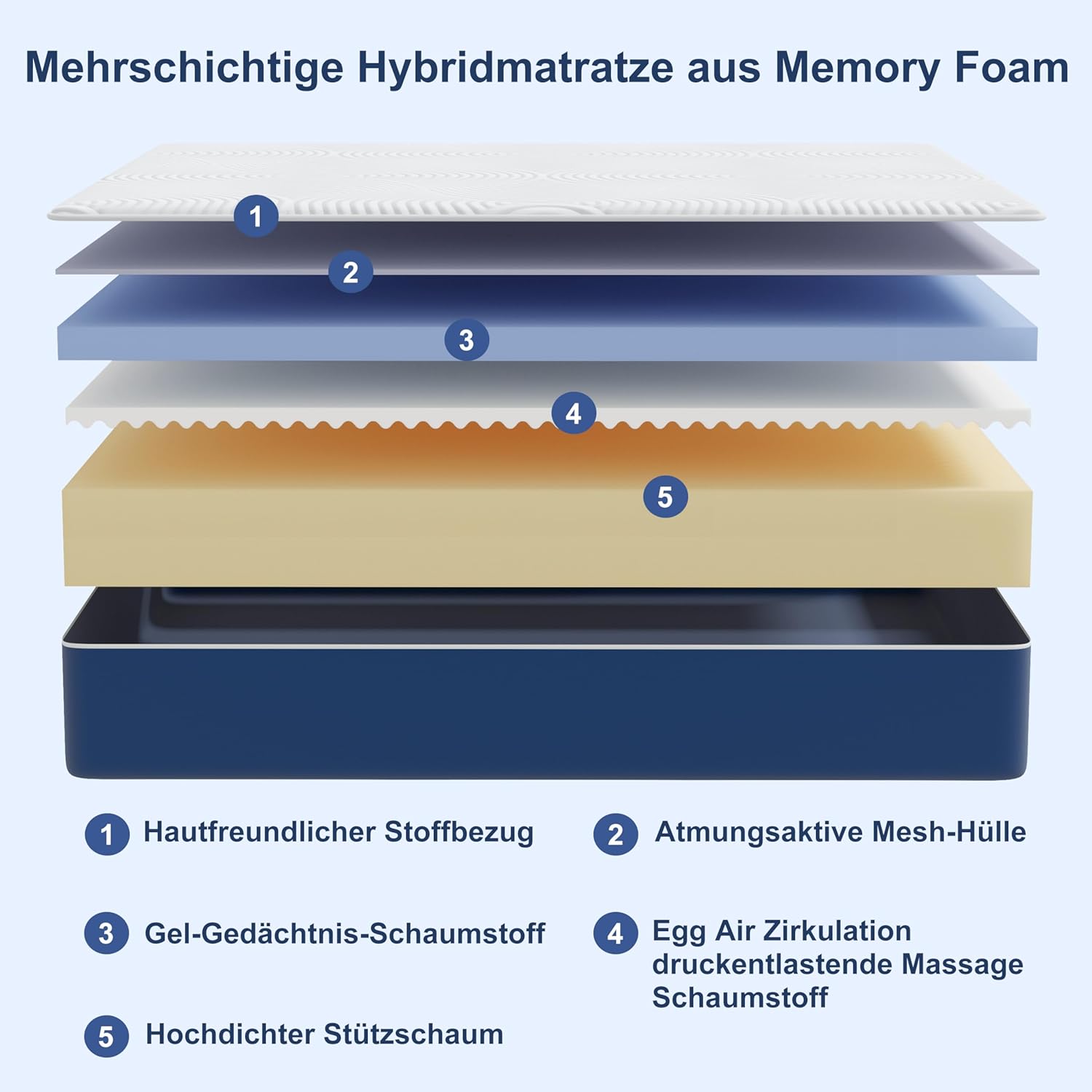 • Dreischichtiger Aufbau aus Cooling-Gel-Memory-Foam, Wellen-Memory-Foam und hochverdichtetem Trägerschaum