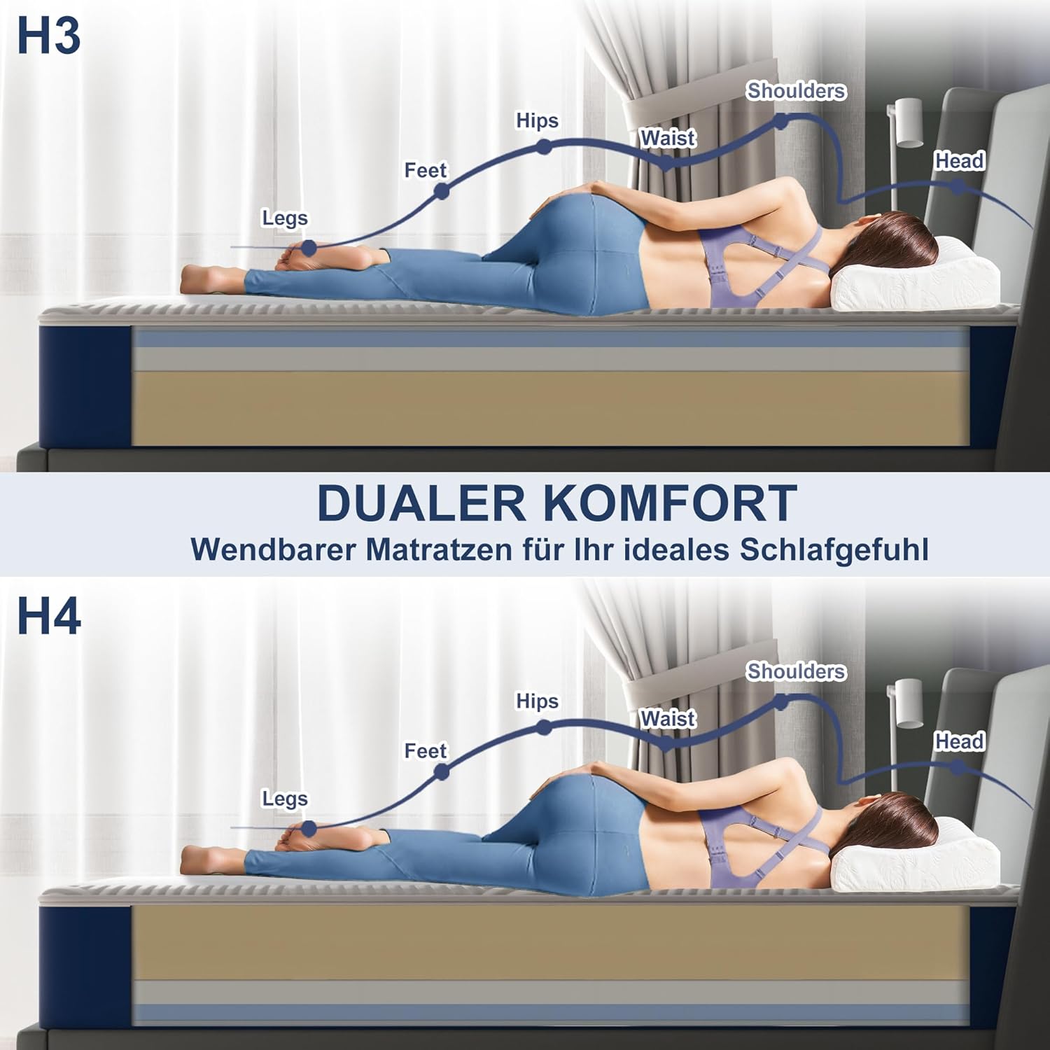 Der H3-Grad ist zudem ideal für Paare mit unterschiedlichem Körpergewicht, da die punktelastischen Eigenschaften der Memory-Foams sicherstellen, dass beide Partner unabhängig voneinander optimal liegen. Es entstehen keine Störzonen, die den anderen beeinträchtigen könnten.