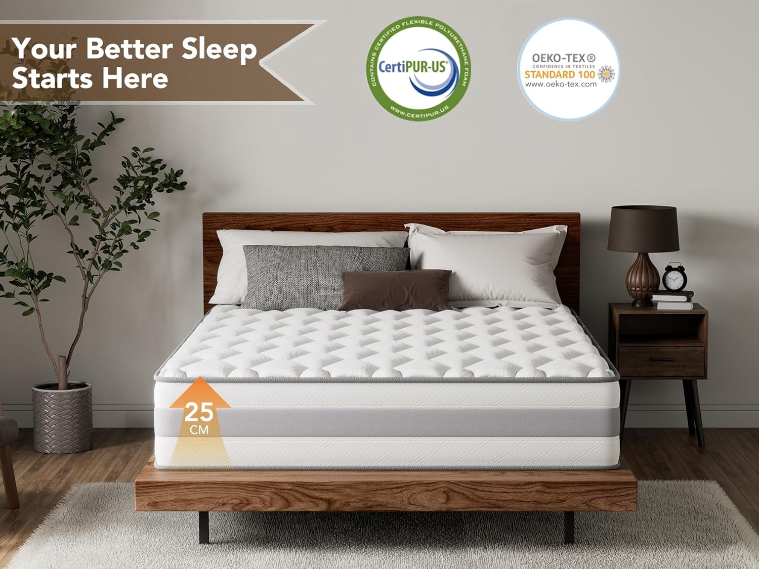 Schlaf ist nicht nur Erholung – er ist die Grundlage für ein gesundes, vitales Leben. Gerade in hektischen Zeiten, in denen der Alltag uns fordert und unser Körper stets Höchstleistung bringen muss, verdient der Schlafplatz im Schlafzimmer besondere Aufmerksamkeit. Die HOMAVO 160 x 200 cm Hybrid-Matratze wurde entwickelt, um genau diesen Ansprüchen gerecht zu werden: eine Matratze, die nicht nur Komfort bietet, sondern echte Schlafqualität schafft. Mit einer Höhe von 25 cm, einem hochwertigen 7-Zonen-Taschenfederkern und einer intelligenten Memory-Foam-Schicht verbindet dieses Modell das Beste aus zwei Welten – stabile Unterstützung und sanfte Anpassung.