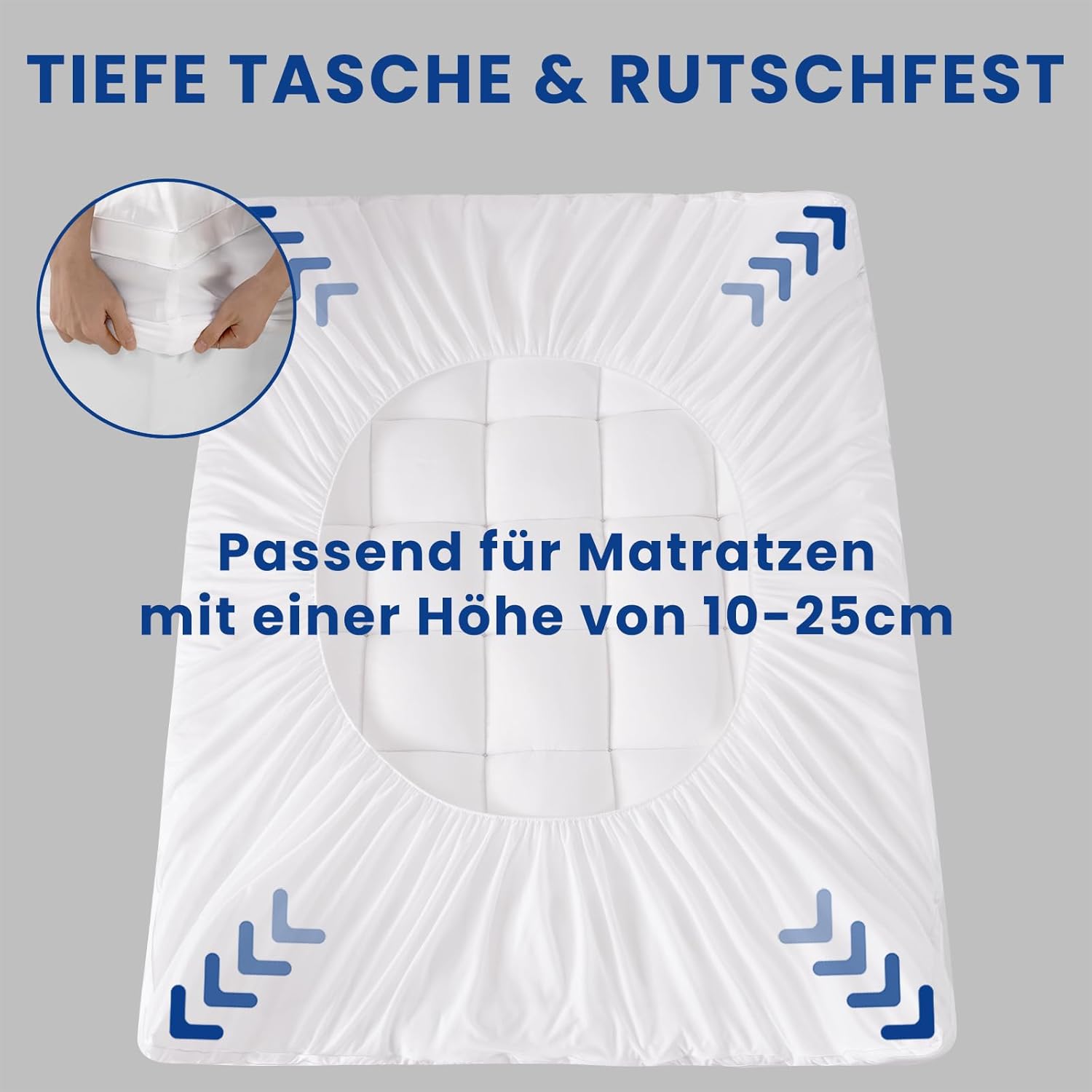Besonders beeindruckend ist der 360°-Dehnbund aus einem speziellen Elastan-Gewebe, das sich dehnt, ohne an Festigkeit zu verlieren. Mit einer Tiefe von bis zu 25 cm passt die Auflage problemlos auf die meisten handelsüblichen Matratzen – egal ob es sich um klassische Federkerne, Kaltschaum- oder Latexmatratzen handelt. Der Bund sitzt so eng, dass die Auflage auch bei hektischen Bewegungen im Schlaf nicht verrutscht – ein echter Sicherheitsfaktor, besonders für unruhige Schläfer oder Kinder.