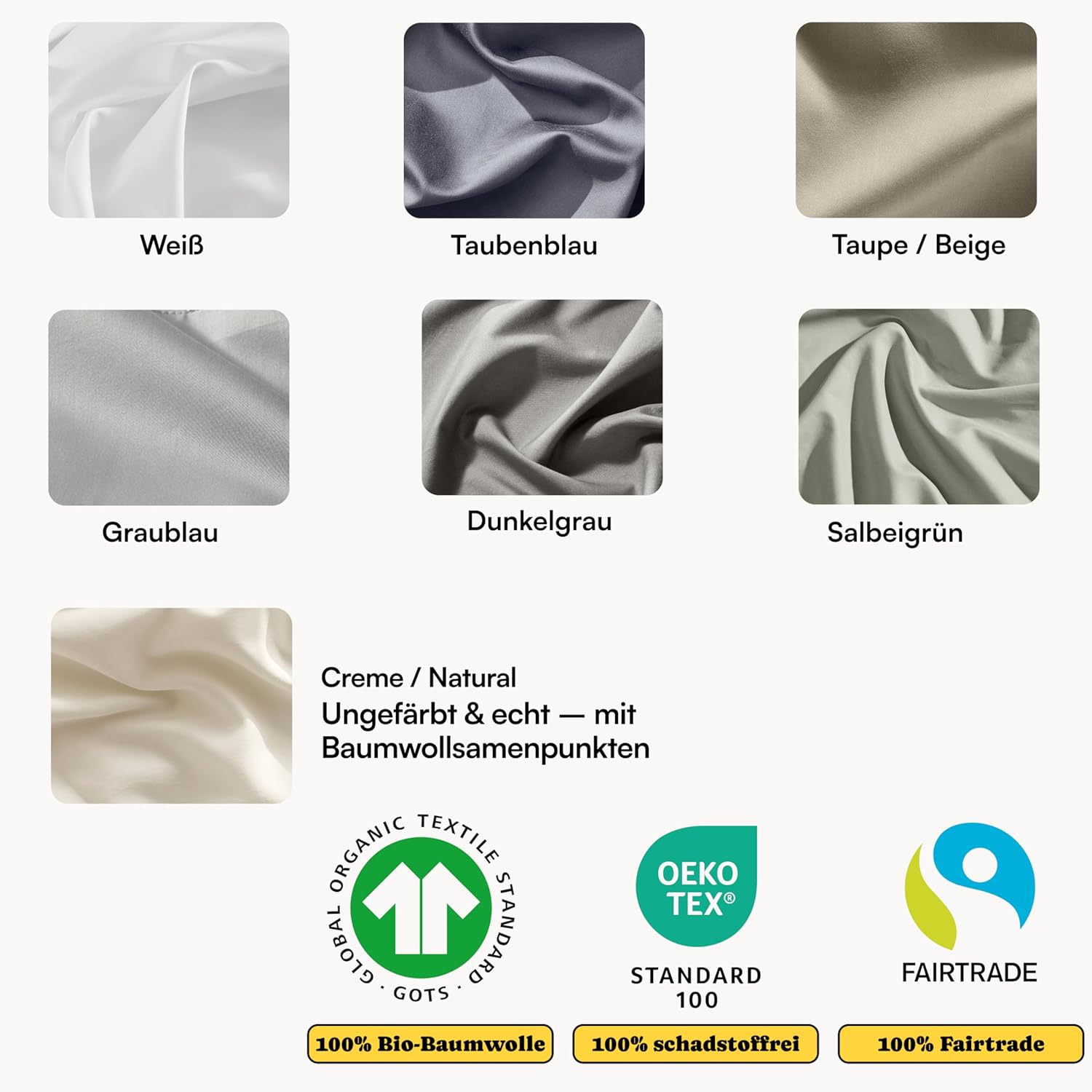 Die Sicherheit und Reinheit des Seralino Spannbetttuchs wird durch mehrere unabhängige Zertifizierungen belegt. Das Global Organic Textile Standard (GOTS)-Siegel garantiert, dass die gesamte Produktionskette – vom Anbau der Baumwolle bis zur Fertigstellung des Endprodukts – strengen ökologischen und sozialen Kriterien entspricht. Darüber hinaus ist das Produkt Fairtrade-zertifiziert, was faire Arbeitsbedingungen, gerechte Löhne und nachhaltige Anbaumethoden für die Baumwollbauern sicherstellt.