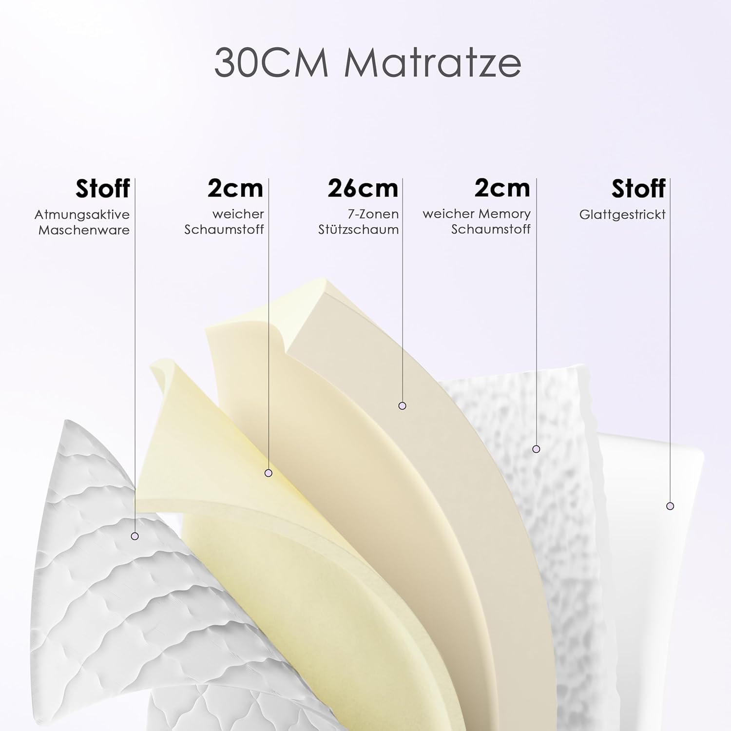 Die 30 cm Gesamthöhe setzt sich aus mehreren funktionalen Schichten zusammen: Eine tragfähige Basis aus hochdichtem Trägerschaum sorgt für Stabilität und verhindert Durchliegen. Darüber liegt die adaptive Komfortschicht aus viskoelastischem Memory-Schaum, die sich millimetergenau an die Körperform anpasst. Diese Schicht nimmt Druckpunkte an Schultern, Hüften und Knien auf und reduziert so die Muskelanspannung während der Nachtruhe.