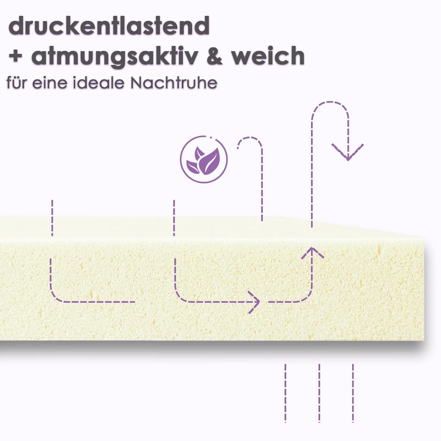 Zusätzlich profitieren Sie von einer optimalen Luftzirkulation durch die offenporige Schaumstruktur. Im Gegensatz zu dichten Matratzen, die schnell warm werden, sorgt die DEWINNER Matratze für ein ausgewogenes Schlafklima – kühl im Sommer, behaglich im Winter.