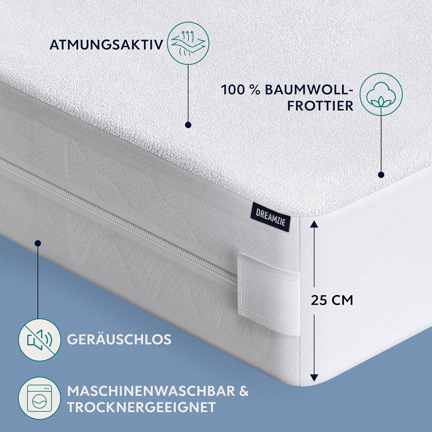 Hergestellt aus einem speziell entwickelten, wasserdichten Material und zertifiziert nach Oeko-Tex Standard 100, garantiert der Dreamzie Matratzenbezug nicht nur maximalen Schutz, sondern auch absolute Hautverträglichkeit. Die innovative Bi-Ome-Behandlung sorgt für eine dauerhafte Abwehr von Allergenen, während der L-förmige Reißverschluss eine vollständige Ummantelung der Matratze ermöglicht – ohne Lücken, ohne Kompromisse. Mit einer Passform, die speziell für Matratzen mit einer Höhe von bis zu 25 cm entwickelt wurde, passt der Bezug perfekt auf gängige Standardmatratzen und verbindet unsichtbaren Schutz mit einem ästhetisch ansprechenden, dezenten Erscheinungsbild in klassischem Weiß.