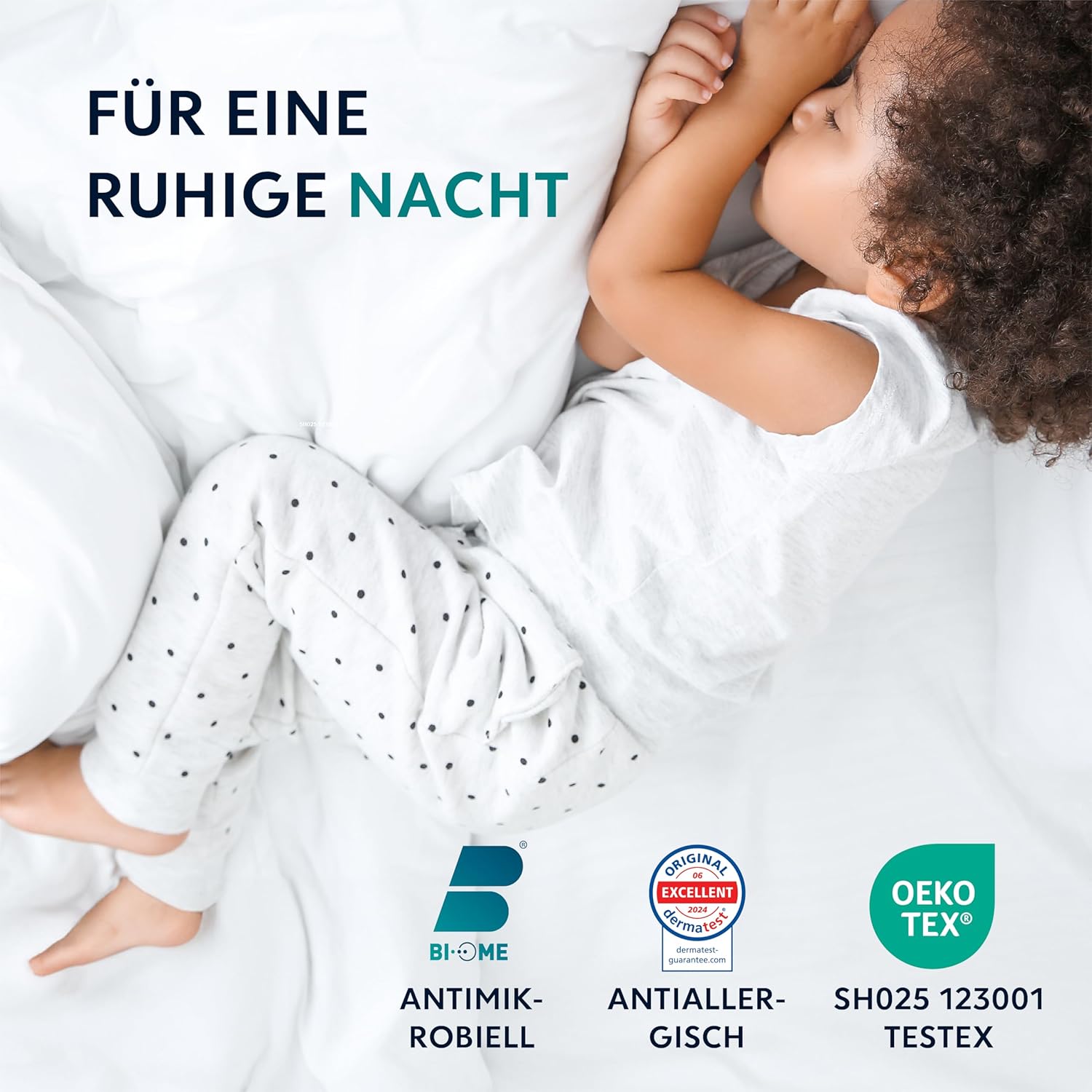 Zusätzlich wird das Material mit Bi-Ome behandelt – einer hochwirksamen, langanhaltenden Technologie, die das Wachstum von Milben und anderen Allergener verhindert. Im Gegensatz zu kurzzeitig wirksamen Sprays oder Puderlösungen bleibt die Wirkung über viele Waschzyklen hinweg erhalten und verliert nicht an Effizienz. Diese Behandlung ist völlig geruchsneutral und wirkt, ohne die Haut zu reizen.