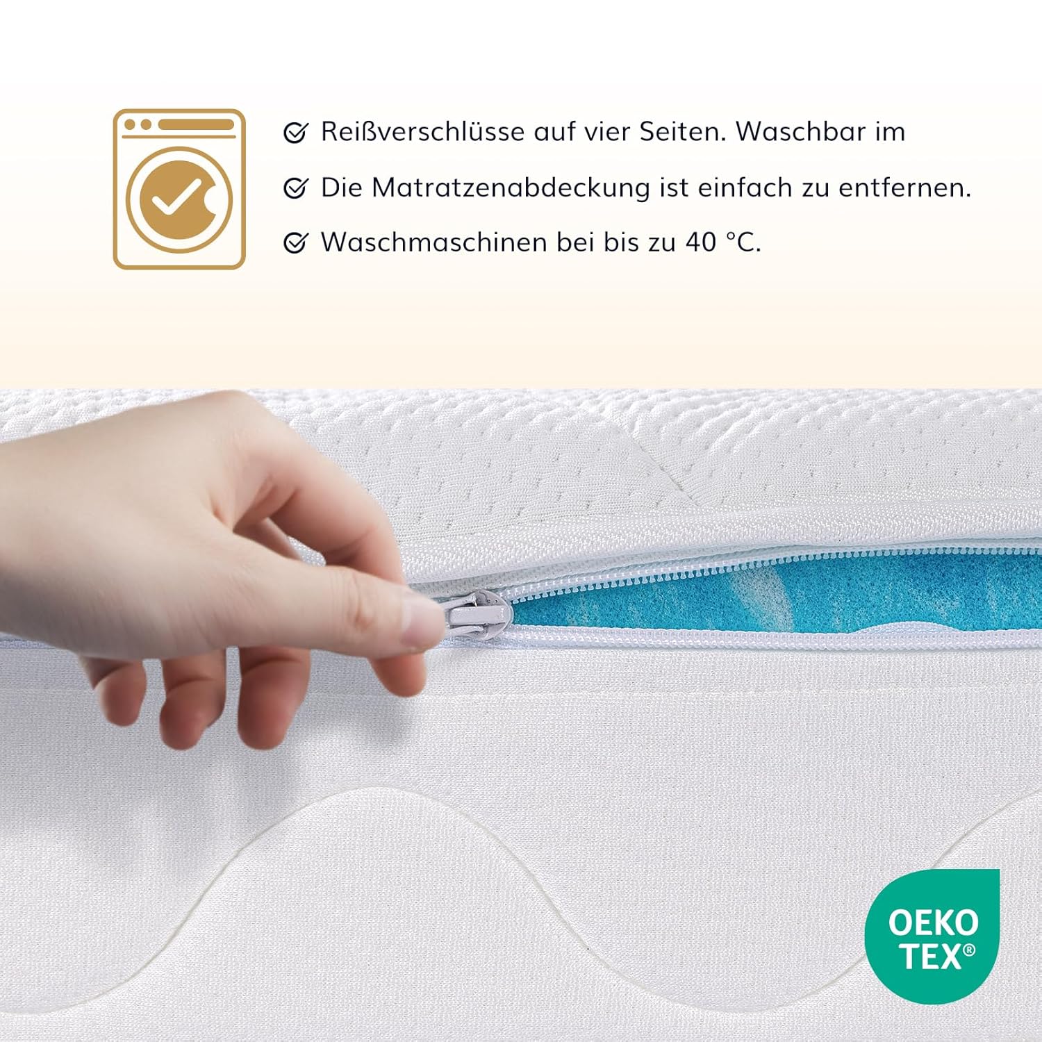 Für Allergiker und Menschen mit empfindlicher Haut ist dieser Bezug ein echter Gewinn. Das Material ist hypoallergen, schadstofffrei und nach dem Öko-Tex Standard 100 zertifiziert – ein internationales Gütezeichen, das sicherstellt, dass keine gesundheitsschädlichen Substanzen wie Weichmacher, Farbstoffe oder Lösungsmittel enthalten sind. Selbst bei empfindlichen Kindern oder Personen mit Neurodermitis kann die Matratze bedenkenlos genutzt werden.