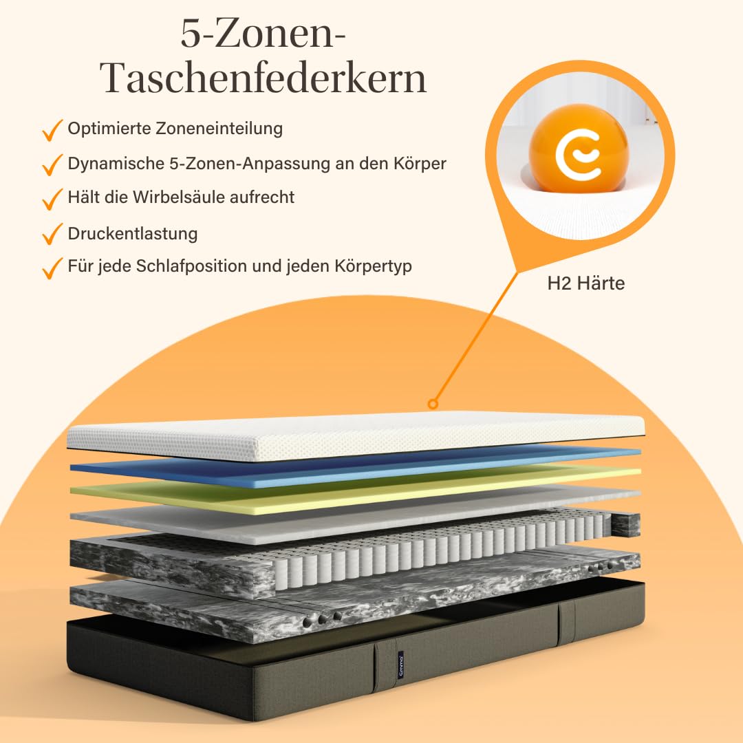• Hochwertige Hybrid-Matratze mit 5-Zonen-Taschenfederkern für optimale Körperanpassung