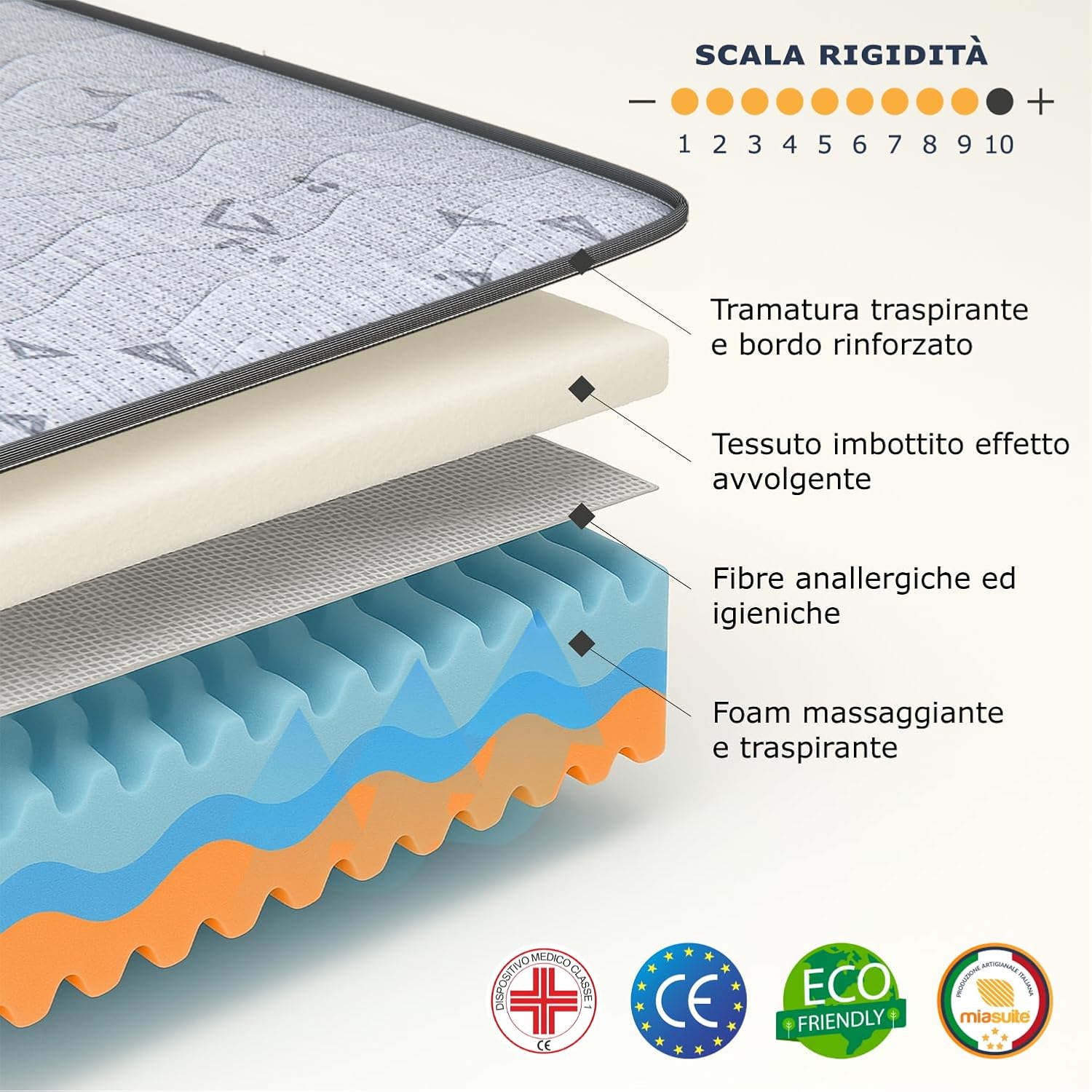 Hergestellt in Italien aus zertifizierten Materialien und als medizinisches Produkt der Klasse 1 zertifiziert, steht die Fiocco Memory Matratze für Vertrauen, Sicherheit und medizinische Qualität. Jede Komponente wurde unter strengen gesundheitlichen und ökologischen Kriterien ausgewählt, um Ihnen und Ihrer Familie den bestmöglichen Schlaf zu garantieren.