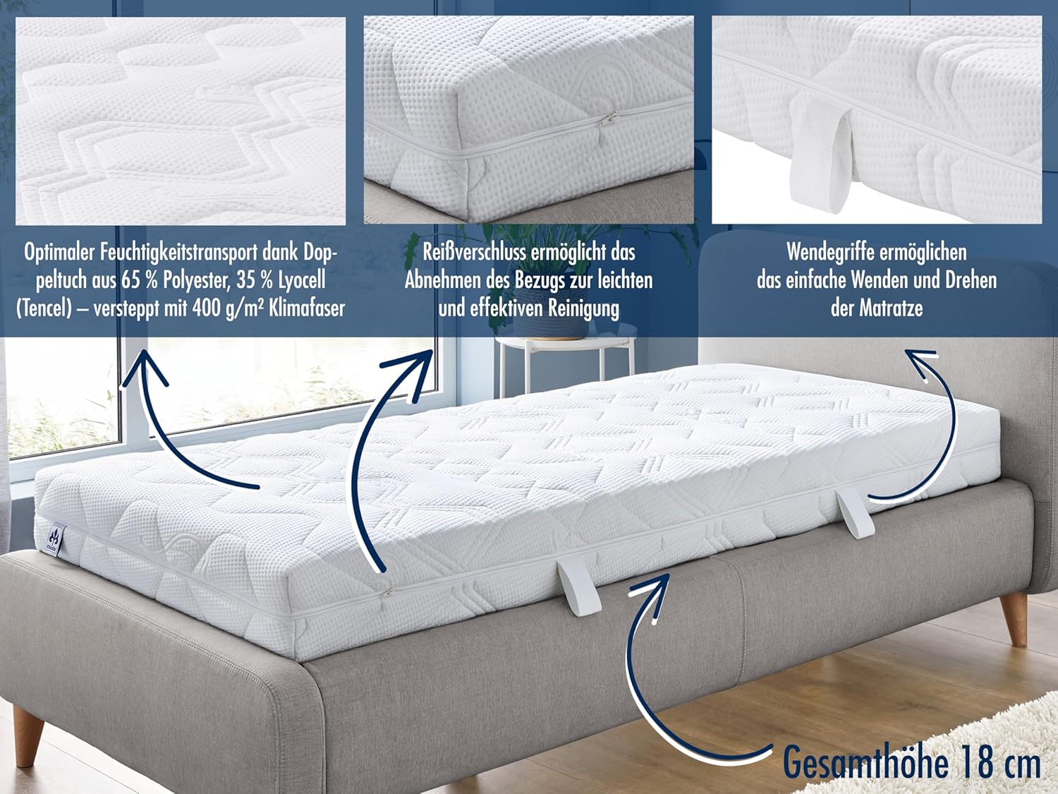 Die Matratze wiegt 24 kg und ist damit stabil, aber nicht unnötig schwer. Sie liegt rutschfest auf jeder Lattenrost- oder Boxspringunterlage und behält ihre Form über viele Jahre. Mit den Abmessungen von 200 x 160 x 18 cm passt sie perfekt in handelsübliche Bettrahmen der Größe 160 x 200 cm.