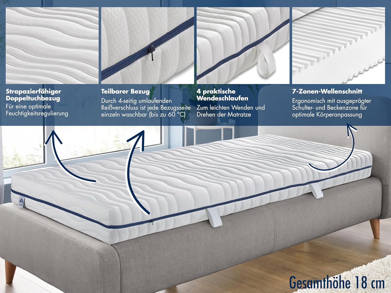 - 18 cm Gesamthöhe für ausgewogenen Liegekomfort