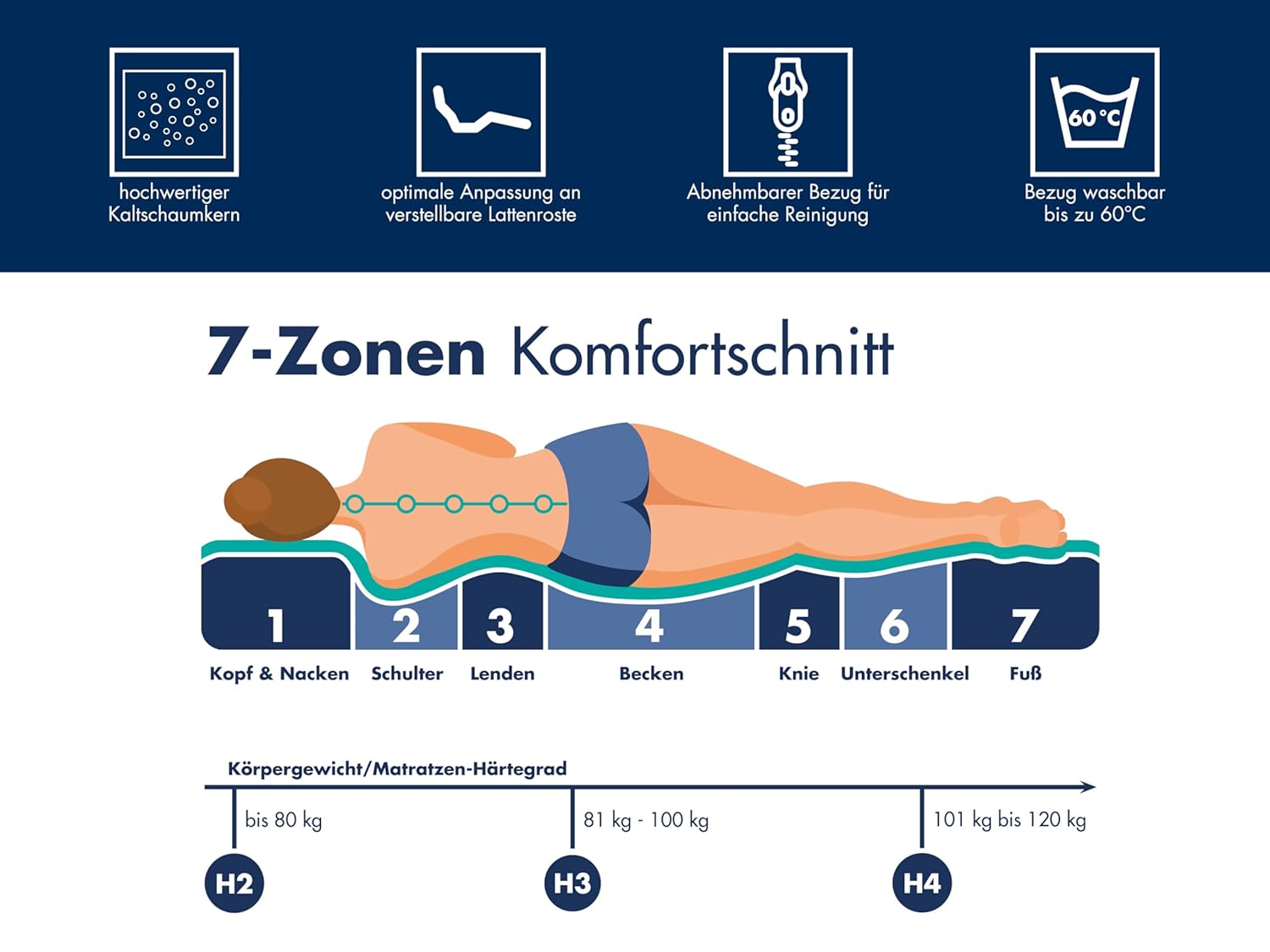 - Zoneneinteilung: 7-Zonen orthopädisch gezielt abgestuft