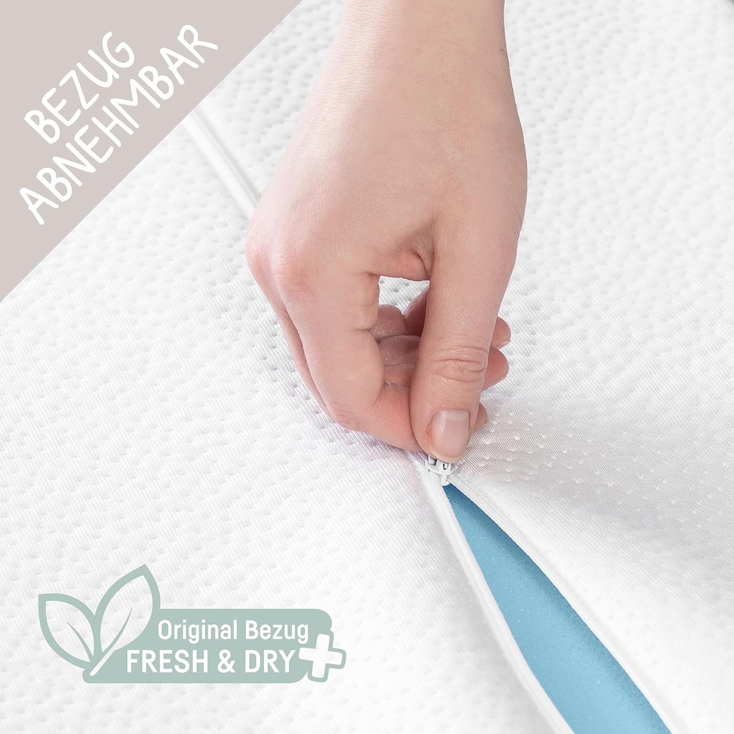 Jedes Detail dieser Premium-Matratze wurde darauf ausgerichtet, optimale Schlafbedingungen zu schaffen, während sie gleichzeitig den strengsten Sicherheitsstandards genügt. Von der atmungsaktiven Baby Fresh & Dry Bezugstechnologie bis zur formstabilen Kaltschaumzelle – hier trifft technologische Innovation auf behutsame Fürsorge. Ob als zentrales Element im klassischen Holz-Wiegebett, als komfortable Schlafstätte im modernen Nestchen oder als flexible Lösung für unterwegs: Diese Matratze wächst mit den Bedürfnissen Ihrer Familie und bietet von der Geburt an bis ins Krabbelalter hinein eine verlässliche, gesunde Schlafbasis.