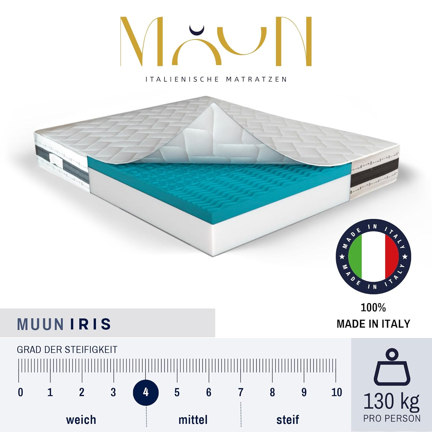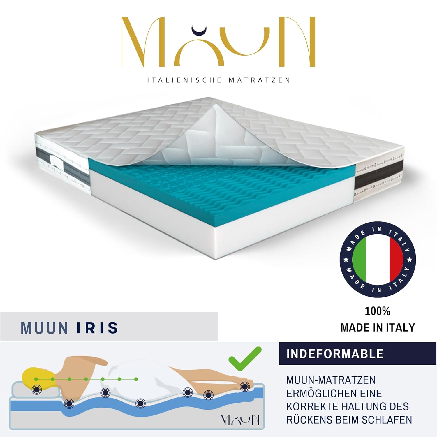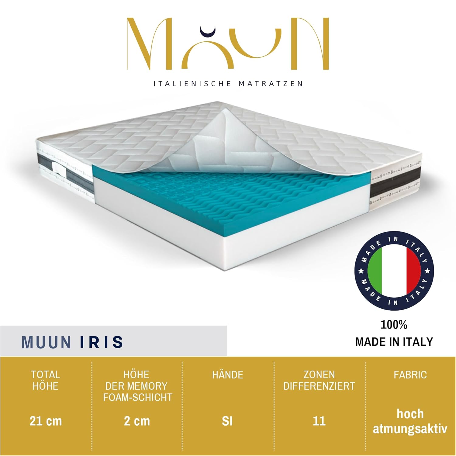 Die MUUN IRIS Matratze ist mehr als ein Möbelstück – sie ist eine Investition in Ihre Gesundheit, Ihr Wohlbefinden und die Qualität Ihres täglichen Lebens. Mit ihrer einzigartigen Mischung aus italienischer Eleganz, technologischer Innovation und langfristiger Langlebigkeit schafft sie die Voraussetzungen für unzählige erholsame Nächte und energiegeladene Tage. Entdecken Sie den Unterschied, den echte Schlafqualität macht – mit der IRIS von MUUN.