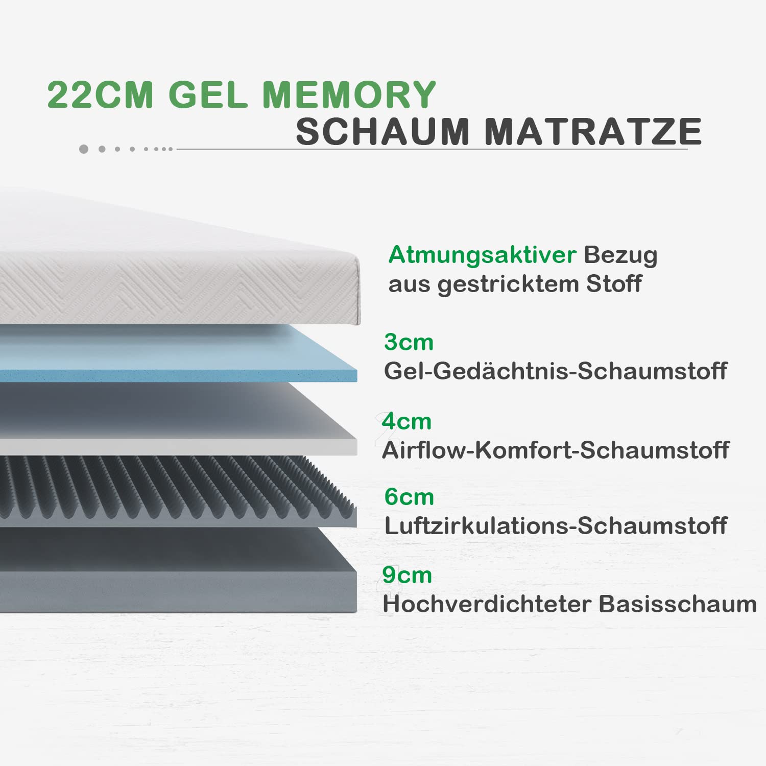 - Gel-Memory-Foam für temperaturregulierenden Komfort und Druckentlastung