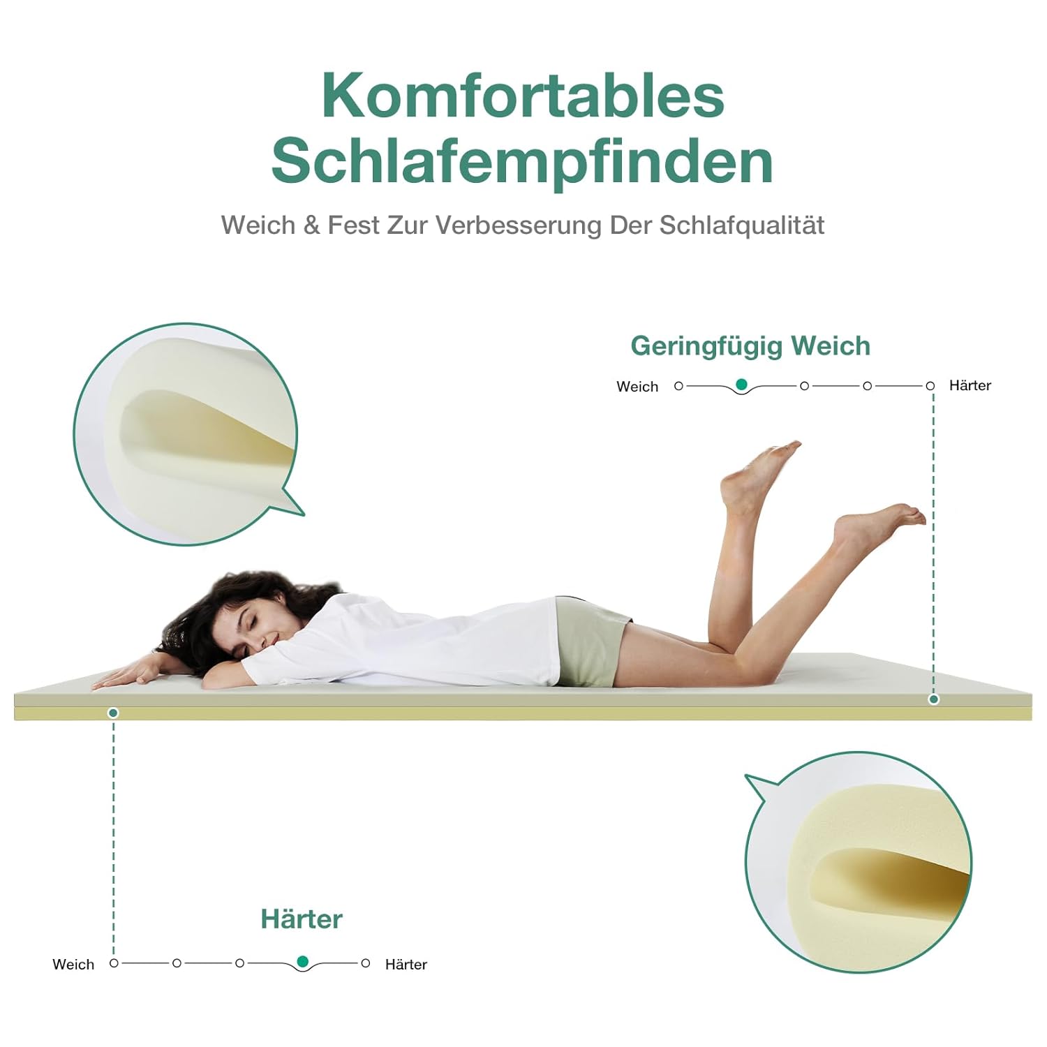 Für Menschen, die unter Rückenproblemen leiden oder eine härtere Schlafunterlage benötigen, bietet der Topper dank seiner hochdichten Unterschicht eine optimale Druckentlastung. Die punktelastische Schaumstruktur passt sich individuell der Körperform an, entlastet Wirbelsäule und Gelenke und verhindert so morgendliche Verspannungen. Ob Sie auf dem Rücken, der Seite oder dem Bauch schlafen – der Topper unterstützt jede Schlafposition mit maßgeschneidertem Komfort.