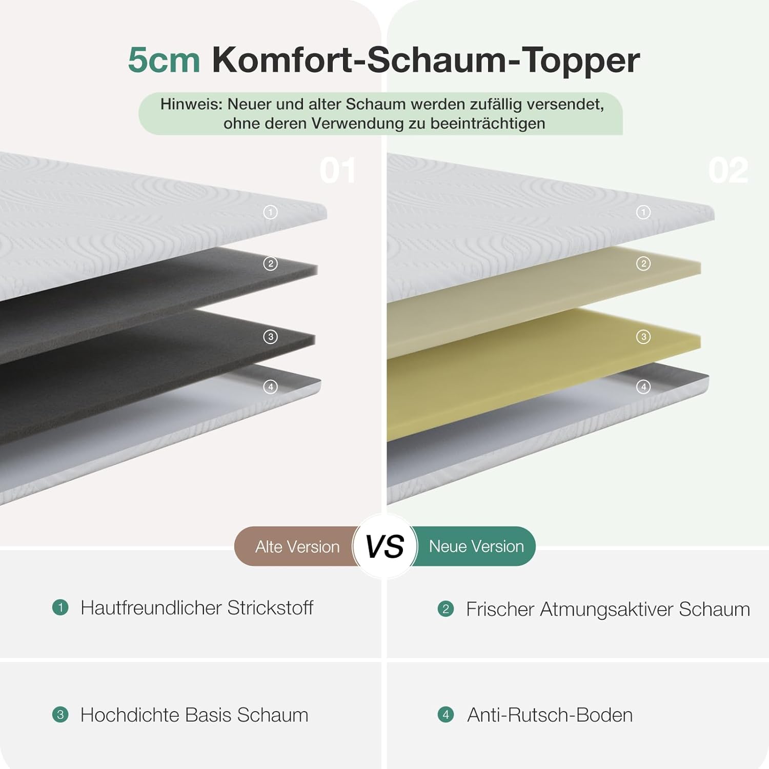 Die untere Schicht aus hochdichtem Trageschaum sorgt für Stabilität und Formbeständigkeit. Sie verhindert Durchliegeeffekte, unterstützt die Wirbelsäule in ihrer natürlichen Ausrichtung und gewährleistet eine lange Lebensdauer des Toppers. Diese Kombination aus Weichheit und Stabilität ist das Ergebnis jahrelanger Forschung und Entwicklung – das Ergebnis ist ein Schlafsystem, das sowohl für junge als auch für ältere Nutzer ideal geeignet ist.