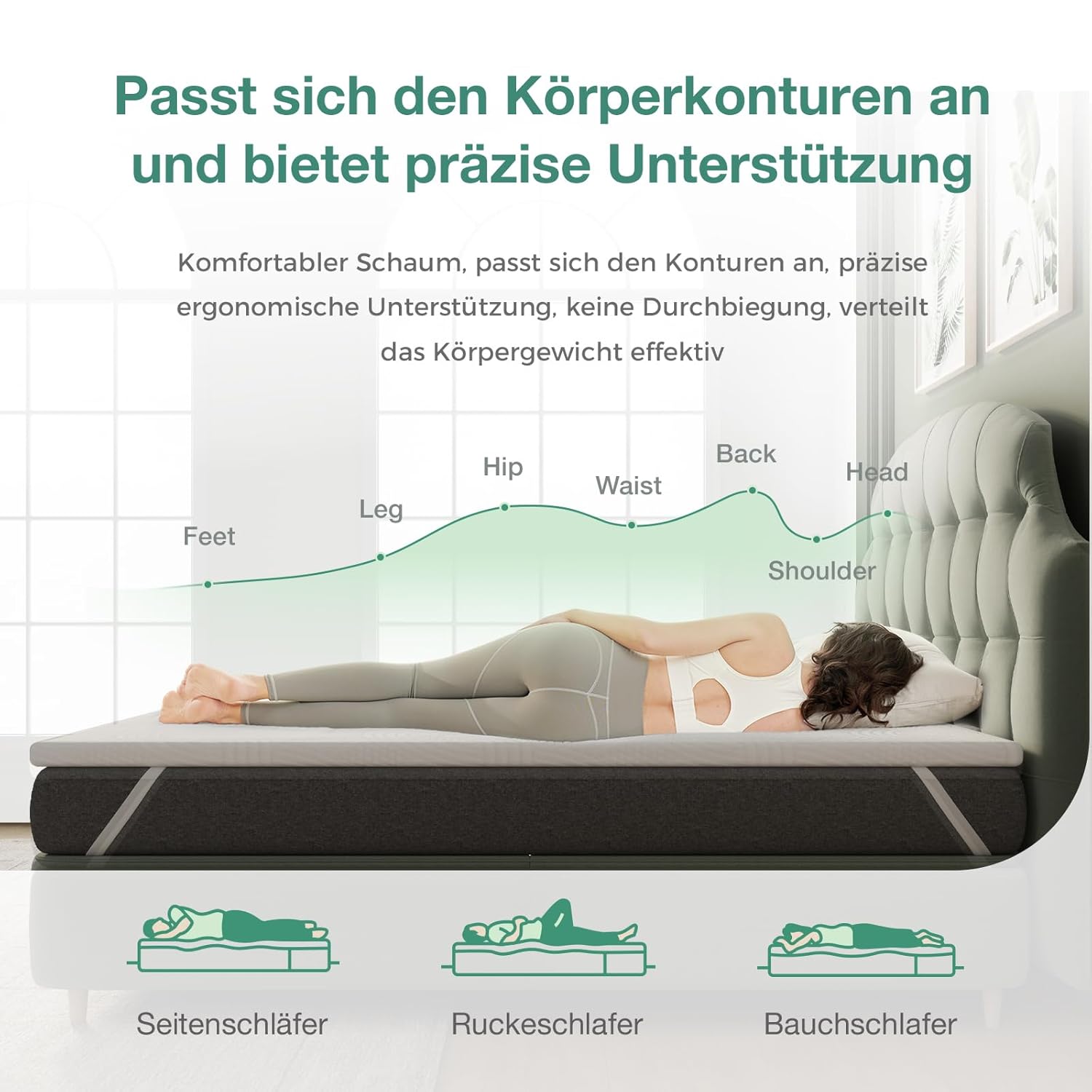 - Ergonomische Unterstützung für alle Schlafpositionen – Rücken-, Seiten- und Bauchschläfer