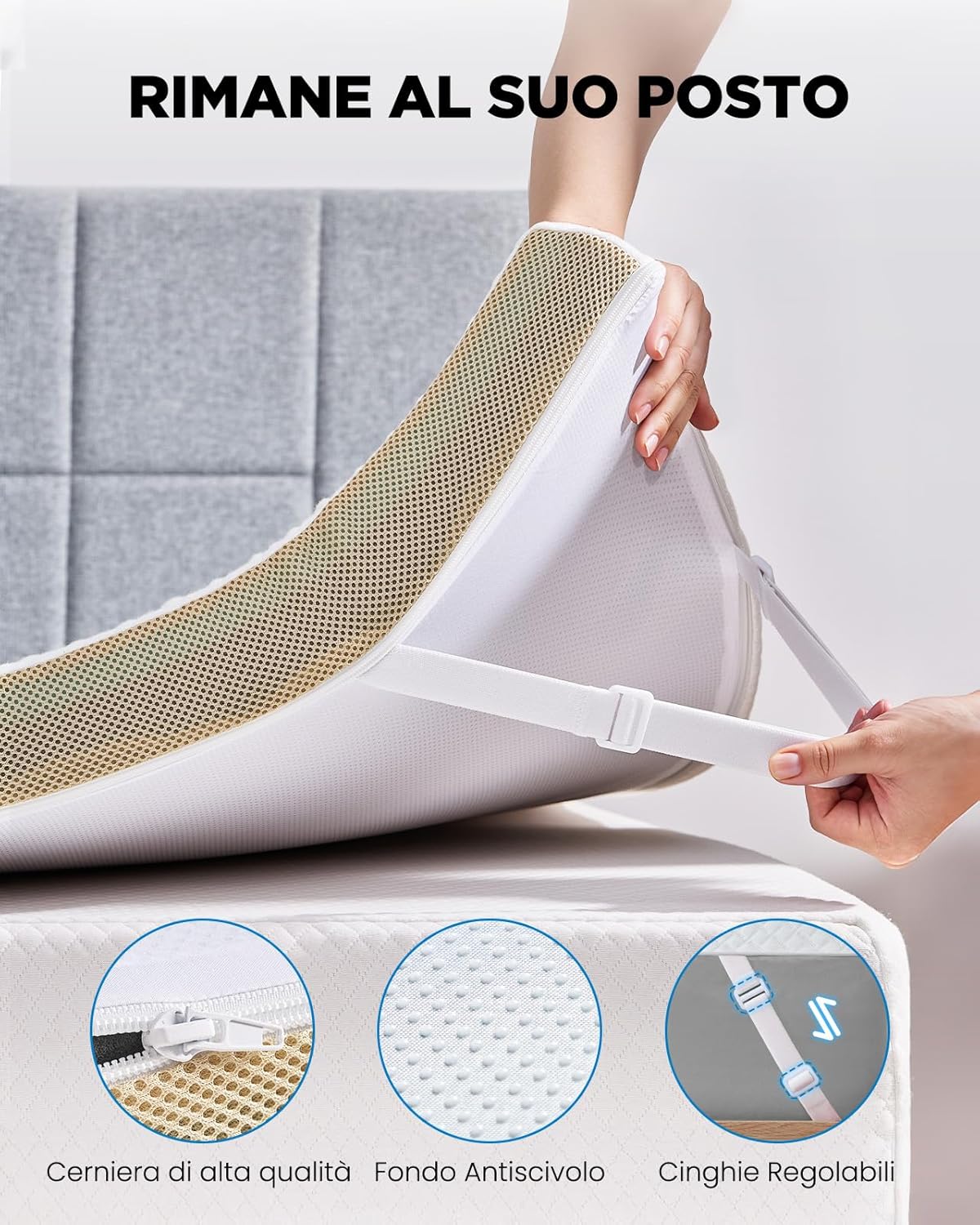 Ein häufiges Problem bei Matratzenauflagen ist das Verrutschen während der Nacht. Der PERLECARE Topper löst dieses Problem mit einer intelligenten Befestigungslösung. Die Unterseite ist mit einer rutschfesten, strukturierten Oberfläche ausgestattet, die einen sicheren Grip auf jeder Matratzenoberfläche gewährleistet. Zusätzlich verfügt der Topper über vier elastische Eckenbänder, die unter der Matratze gespannt werden und den Auflager fest an seinem Platz halten. Diese Bänder sind dehnbar genug, um auch dickeren Matratzen gerecht zu werden, und robust genug, um langfristig ihre Spannkraft zu behalten.