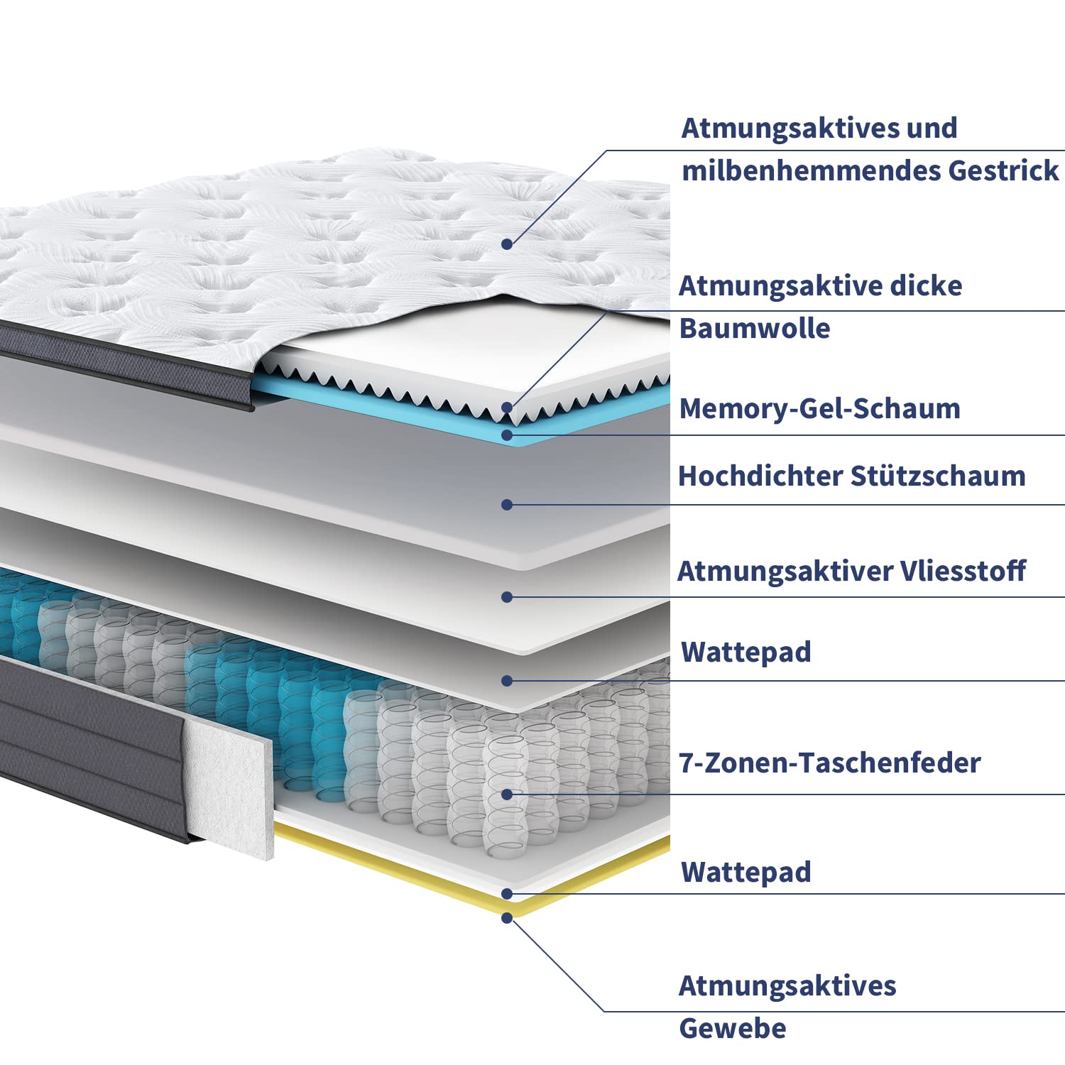 - Materialzusammensetzung: Gel-Memory-Foam, Kaltschaum, Carbon-Stahl-Taschenfedern, Strickbezug