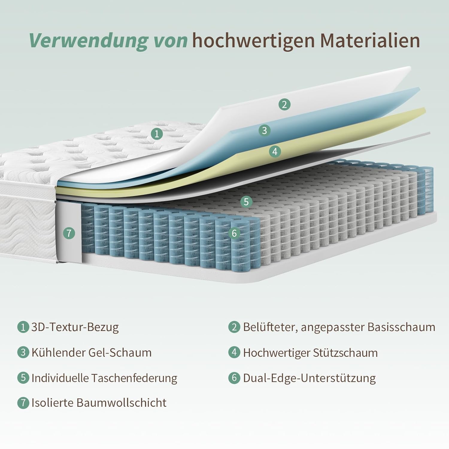 • Kern: 7-Zonen-Taschenfederkern + Komfortschaum mit Gel-Infusion