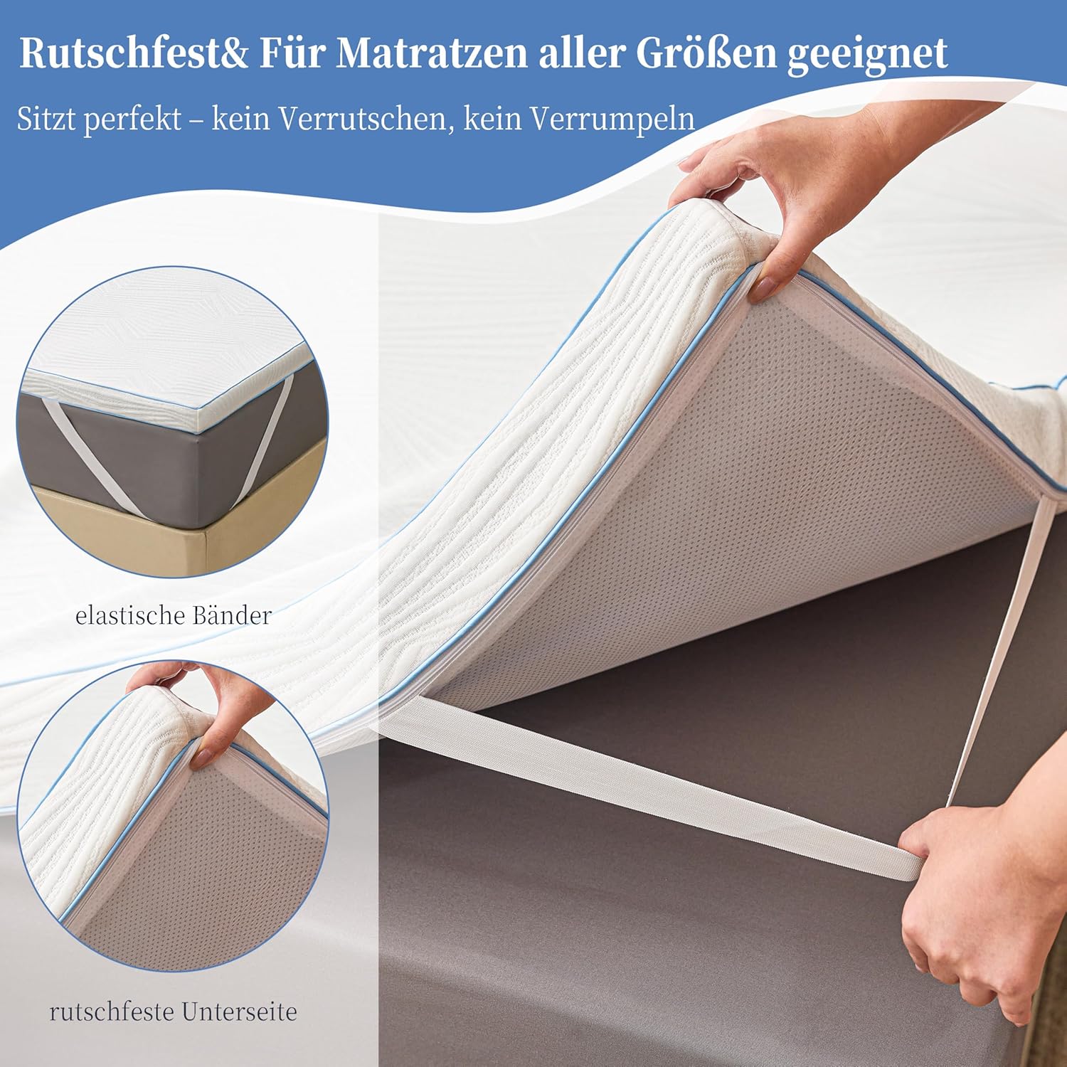 Zusätzlich sorgen vier elastische Bänder an den Ecken für zusätzliche Stabilität. Diese Bänder werden einfach unter der Matratze befestigt und halten den Topper an seinem Platz – auch bei unruhigem Schlaf oder häufigem Umlagern. Das System ist so konstruiert, dass es sich an Matratzen unterschiedlicher Stärken anpasst, ohne zu sehr zu spannen oder zu lockern. Das Ergebnis ist ein fest sitzender Topper, der sich wie eine natürliche Verlängerung der Matratze anfühlt.