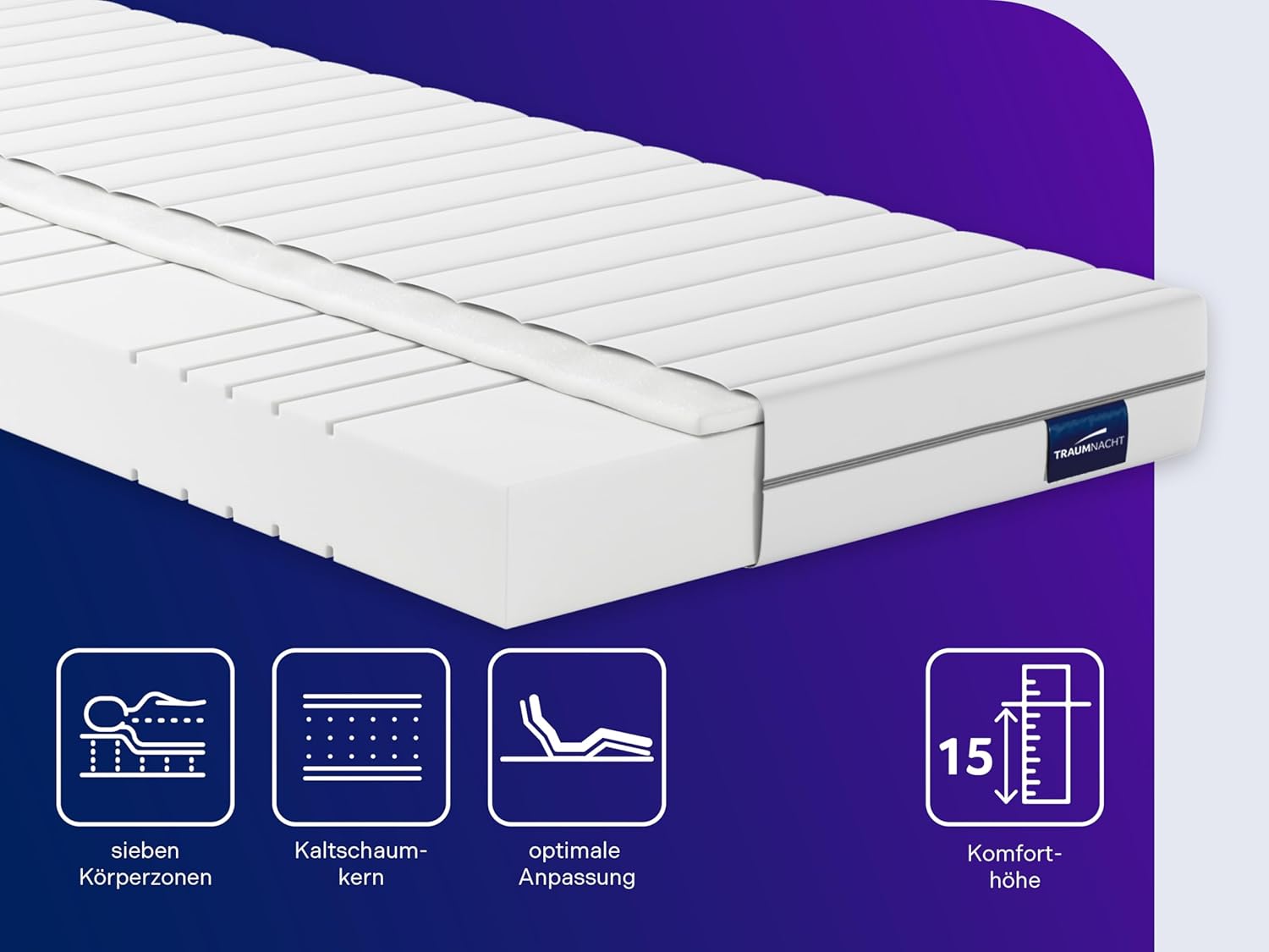 Schlaf ist mehr als nur Ruhepause – er ist die Grundlage für Wohlbefinden, Leistungsfähigkeit und langfristige Gesundheit. Die Traumnacht Base Cold Foammatratze mit 7-Zonen-Schnitt wurde entwickelt, um genau diese Bedürfnisse zu erfüllen: einen tiefen, erholsamen Schlaf, der den Körper regeneriert und den Geist erfrischt. Mit einer intelligenten Kombination aus hochwertigem Kaltschaumkern, körpergerechter Punktelastizität und einem atmungsaktiven Bezug bietet diese Matratze eine Schlafumgebung, die sich individuell an jede Schlafposition und jeden Körpertyp anpasst. Ob Sie auf dem Rücken, der Seite oder dem Bauch schlafen – die Traumnacht Base sorgt für optimale Wirbelsäulenentlastung und ein Gefühl von müheloser Entspannung.