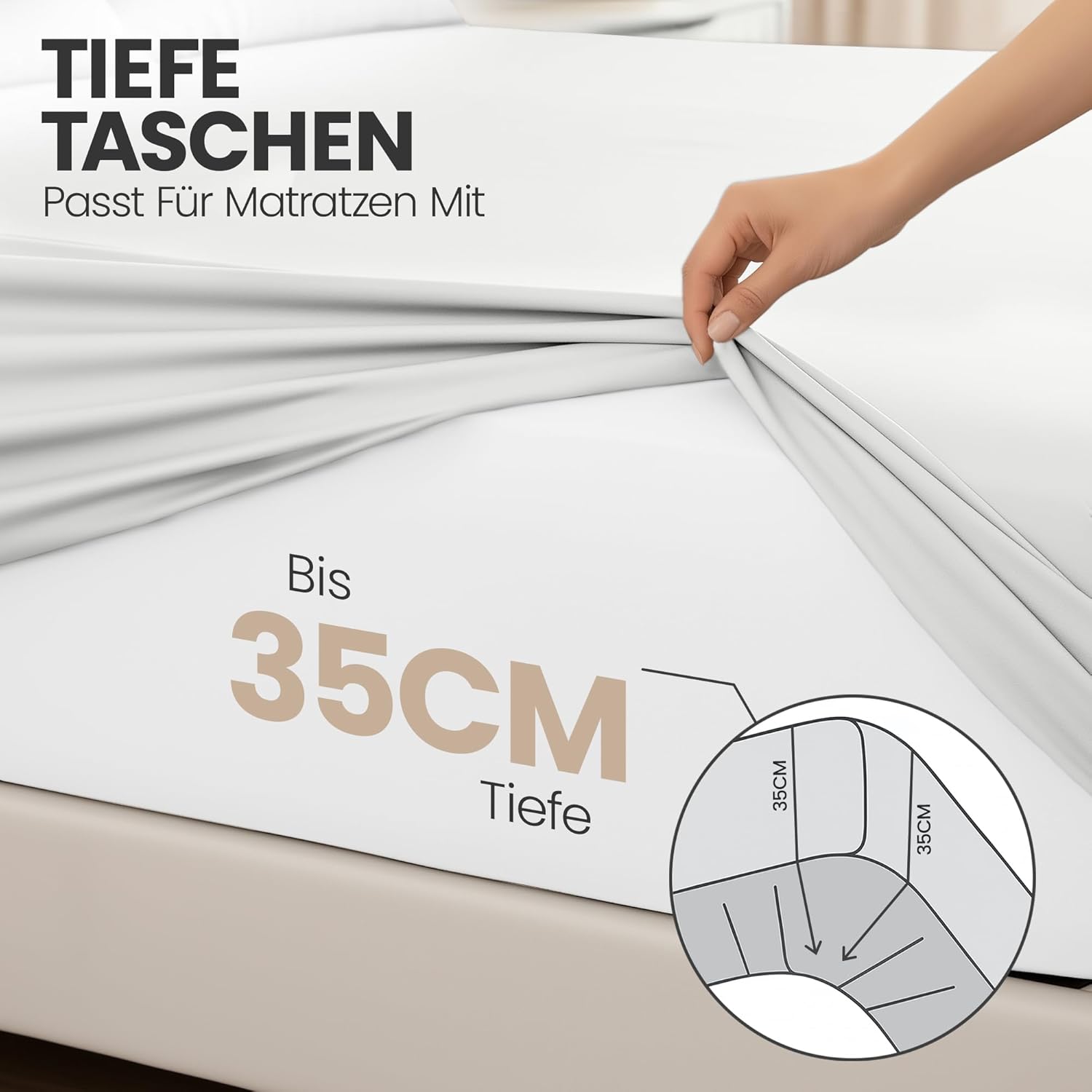 Die 35-cm-Taschentiefe ist kein willkürlicher Wert, sondern das Ergebnis intensiver Marktforschung. Moderne Matratzen, insbesondere hochwertige Modelle mit mehreren Liegezonen oder dicken Toppern, sind deutlich höher als noch vor zehn Jahren. Viele verfügbare Spannlaken auf dem Markt reichen nicht aus, um diese Matratzen vollständig zu umschließen – das Ergebnis sind lose hängende Ecken oder ein Laken, das sich beim Schlafen löst. Mit dem Utopia Bedding Set ist dieses Problem der Vergangenheit angehören.