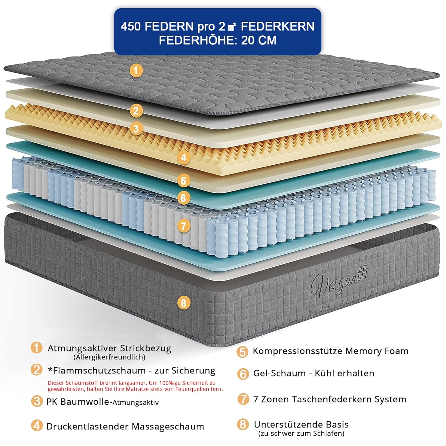 Die Vesgantti 7-Zonen Taschenfederkernmatratze ist mehr als nur ein Schlafaccessoire – sie ist eine Investition in Ihre Gesundheit, Ihr Wohlbefinden und die Qualität Ihres täglichen Lebens. Jede Komponente wurde mit Bedacht ausgewählt, jedes Detail durchdacht, um Ihnen und Ihrer Familie den bestmöglichen Schlaf zu schenken. Entdecken Sie den Unterschied, den echte Qualität macht – jede Nacht aufs Neue.