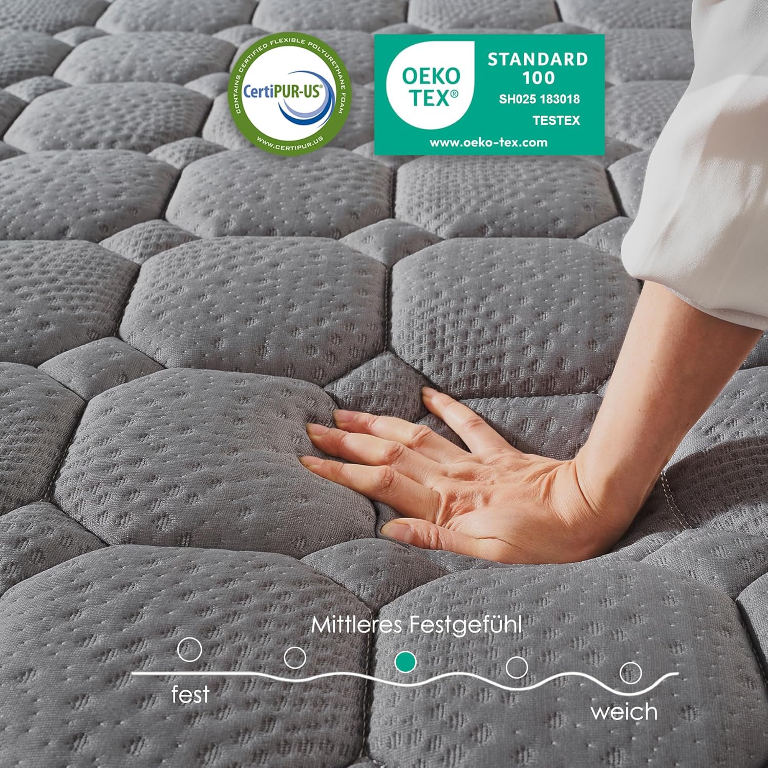 Hergestellt nach höchsten Qualitätsstandards und zertifiziert nach dem Oeko-Tex Standard 100, steht die Vesgantti Matratze für Sicherheit, Nachhaltigkeit und Made-in-Germany-Qualität. Jede Komponente wurde sorgfältig ausgewählt, um Ihnen nicht nur in der ersten, sondern auch in der hundertsten Nacht denselben exzellenten Liegekomfort zu bieten.