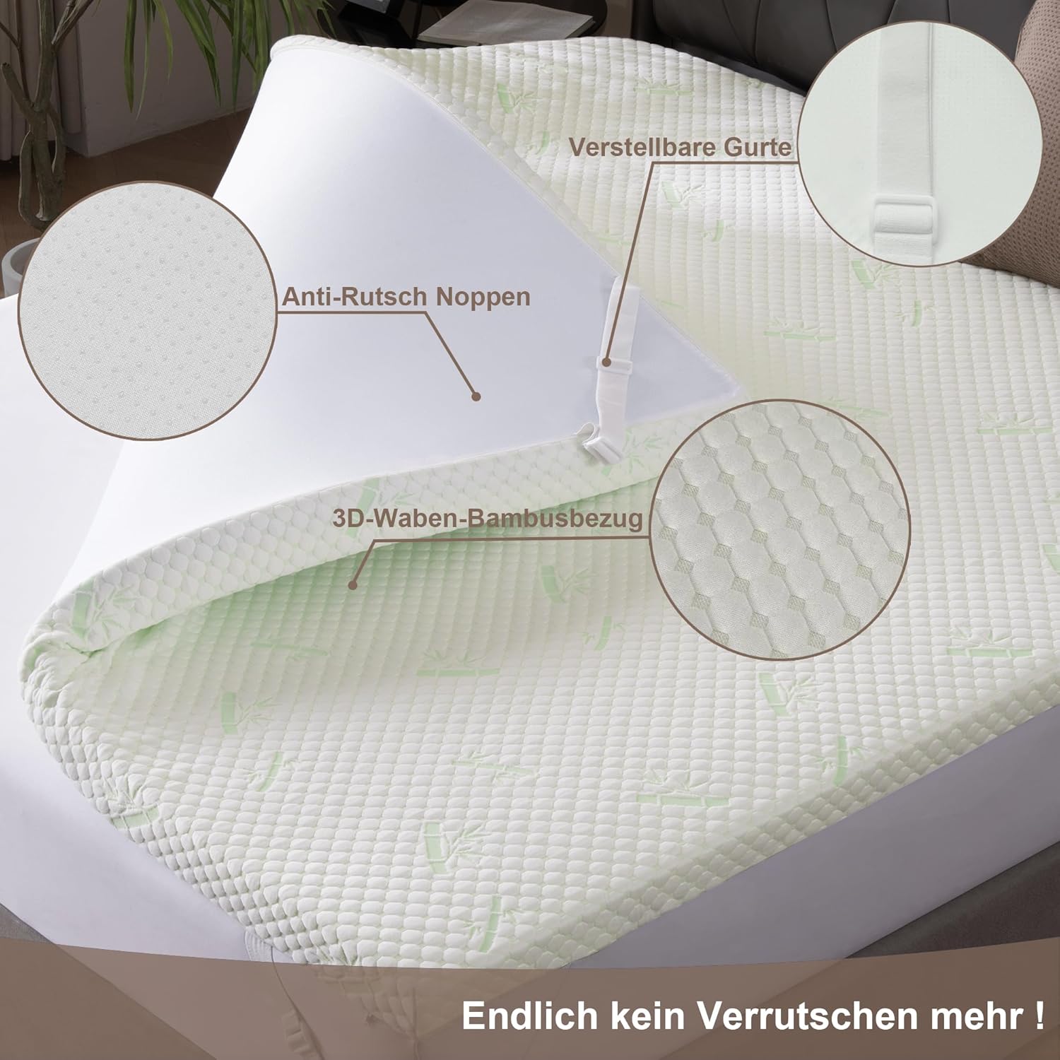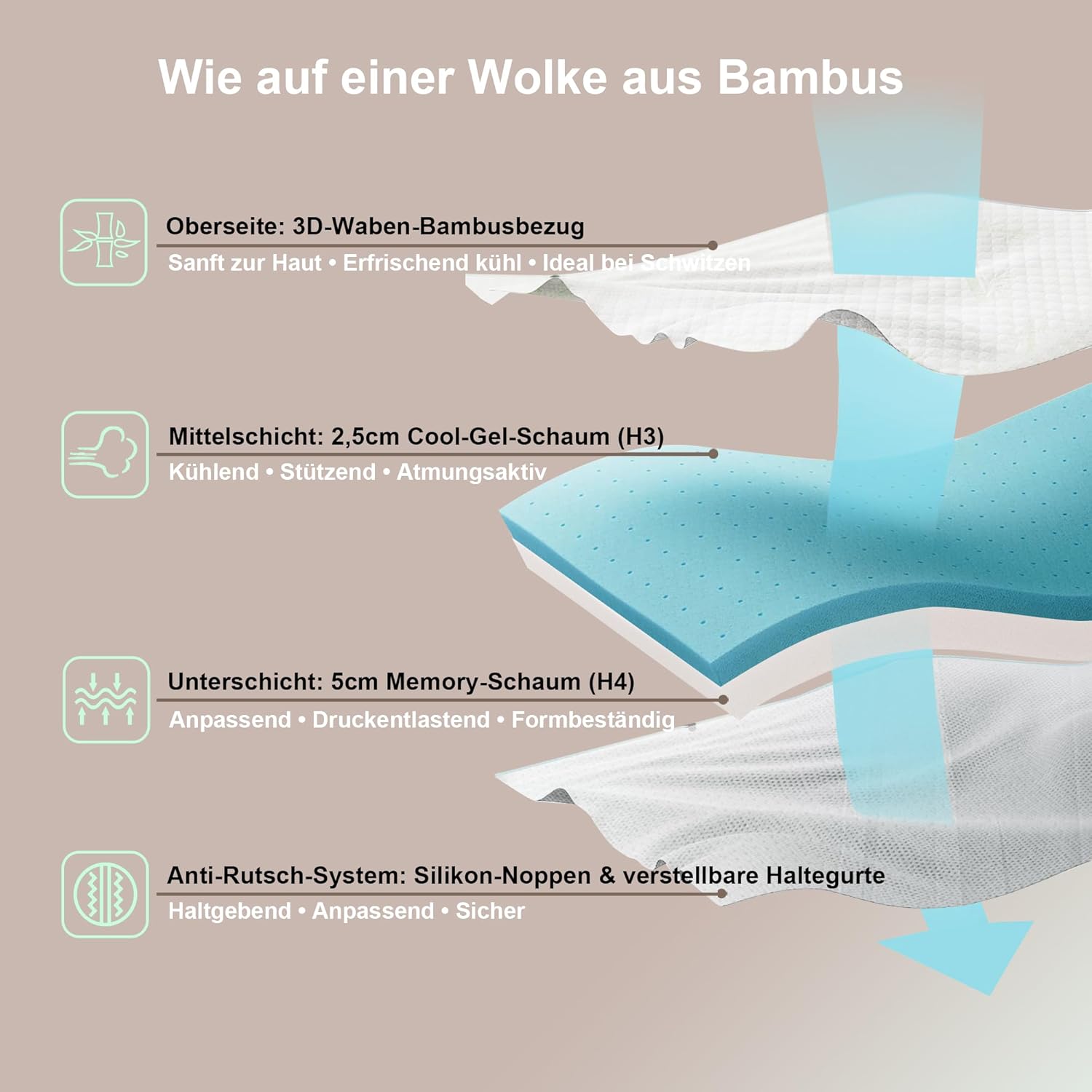 Die rutschfeste Unterseite mit Anti-Slip-Punkten und den verstellbaren Spanngurten sorgt dafür, dass die Auflage auch bei unruhigem Schlaf oder auf schrägen Unterlagen sicher an ihrem Platz bleibt. So können Sie sich ganz auf das Wesentliche konzentrieren: tief und ungestört zu schlafen.