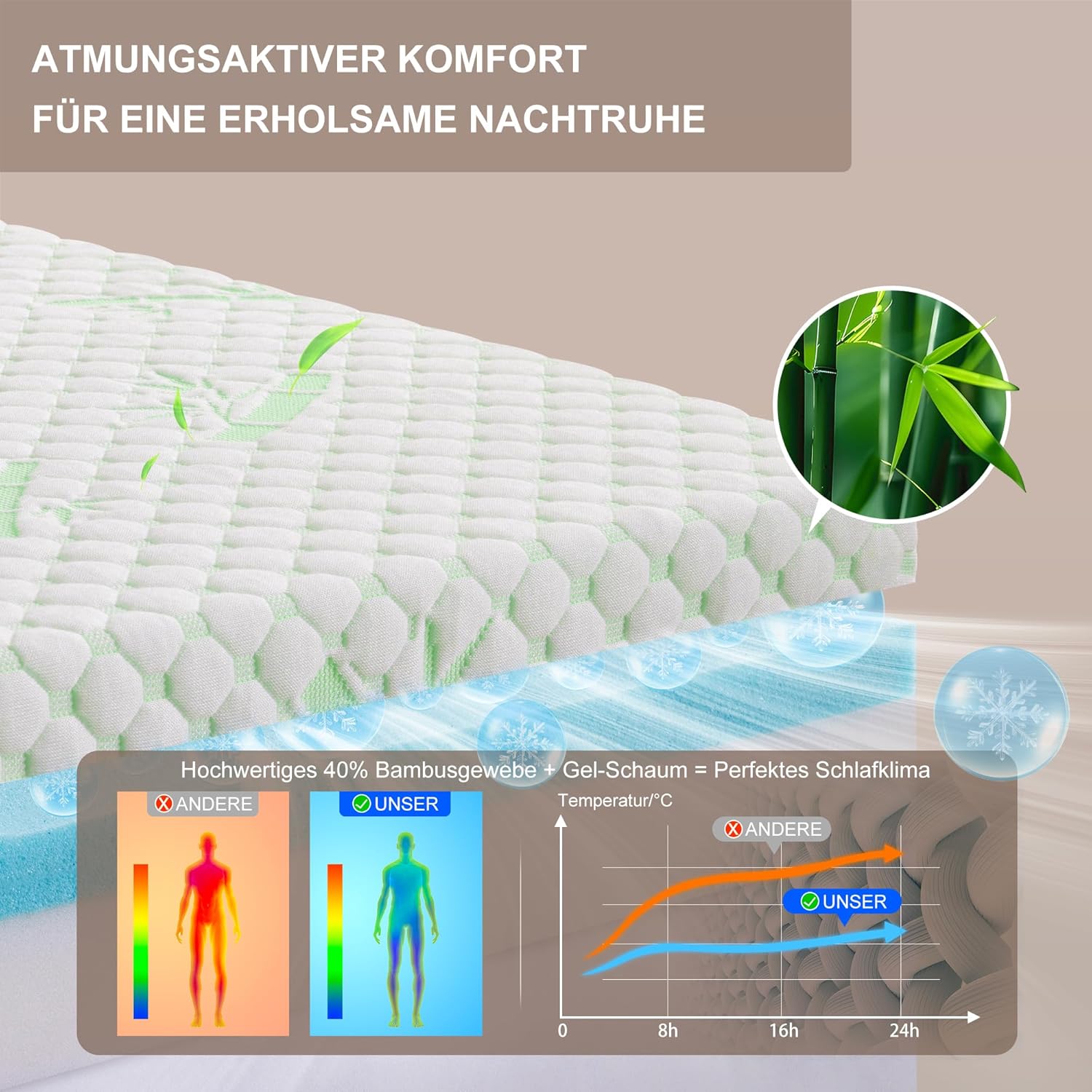 - Materialzusammensetzung: Gel-Memory-Foam, viskoelastischer Memory-Foam, Bambus-Viskose-Mischgewebe