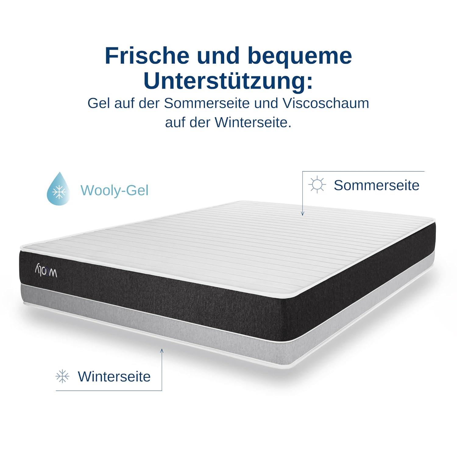 Im Herzen der Wooly Mattress schlägt eine doppelte Innovation: Naturschafwolle und aktives Gel arbeiten Hand in Hand, um das ideale Schlafklima zu schaffen – ganz gleich, ob draußen Schnee fällt oder die Sommerhitze die Stadt erhitzt. Die in den Bezug eingearbeitete Schafwolle stammt aus kontrolliert biologischer Tierhaltung und ist nicht nur Oeko-Tex Standard 100 zertifiziert, sondern auch ein natürlicher Klimaregulator. Im Winter speichert sie Wärme und schenkt Ihnen ein behagliches, fast schon mütterliches Gefühl von Geborgenheit. Im Sommer hingegen leitet sie Feuchtigkeit ab und sorgt für ein trockenes, frisches Schlafklima.