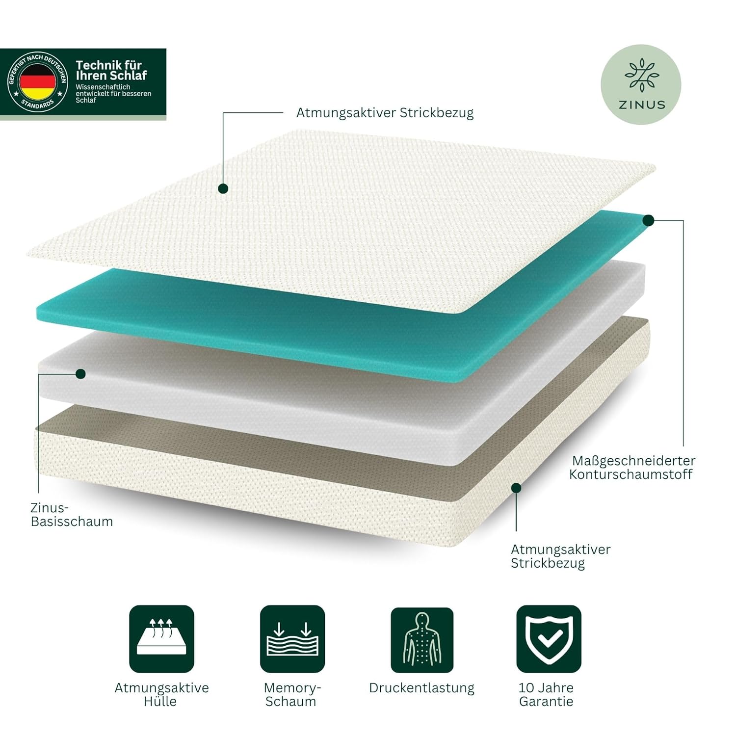 Darüber liegt eine 4 cm dicke Memory-Foam-Oberfläche, die das Highlight des Schlafkomforts darstellt. Dieser hochwertige viskoelastische Schaum reagiert sensibel auf Körperwärme und -druck, formt sich millimetergenau den Konturen Ihres Körpers nach und entlastet gezielt die druckbelasteten Regionen wie Schultern, Hüften und Knien. Im Gegensatz zu herkömmlichen Matratzen, die punktuell Druckstellen verursachen können, verteilt die Zinus Matratze das Körpergewicht gleichmäßig und reduziert so Muskelverspannungen und nächtliches Wälzen. Die Kombination beider Schichten schafft ein einzigartiges Schlafgefühl: stabil wie eine orthopädische Matratze, weich wie ein云端-Bett.