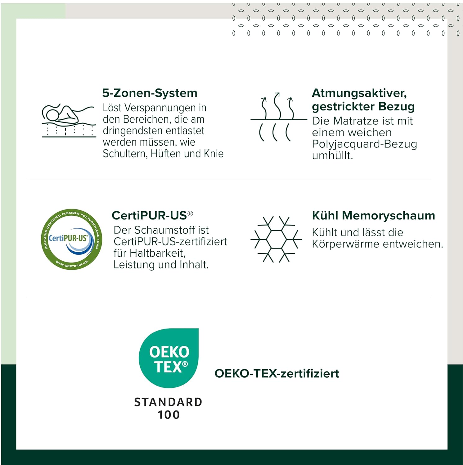 • Materialkern: 7 cm hochdichter Kaltschaum + 4 cm Memory-Foam